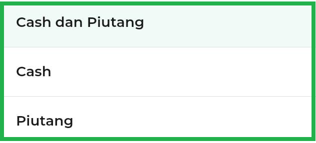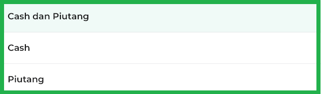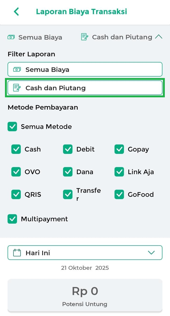 - Cash dan Piutang: Menampilkan semua transaksi, baik yang dibayar tunai ataupun masih piutang.