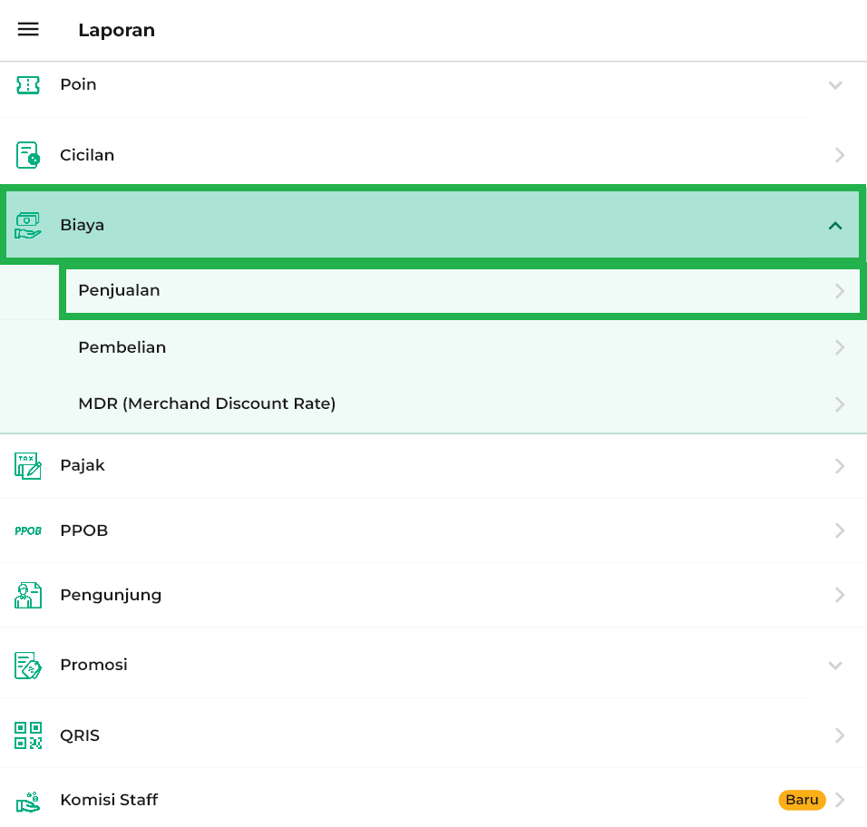 3. Klik opsi Laporan Biaya → Penjualan pada halaman laporan.