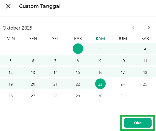 Jika Anda memilih Custom Tanggal, Anda dapat memilih jangka waktu periode berdasarkan keinginan Anda. Setelah itu klik Oke.