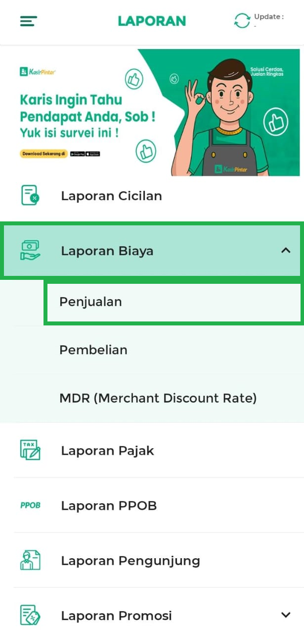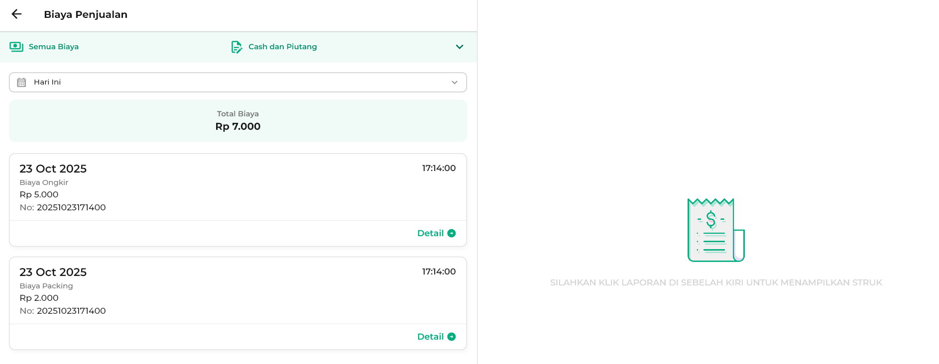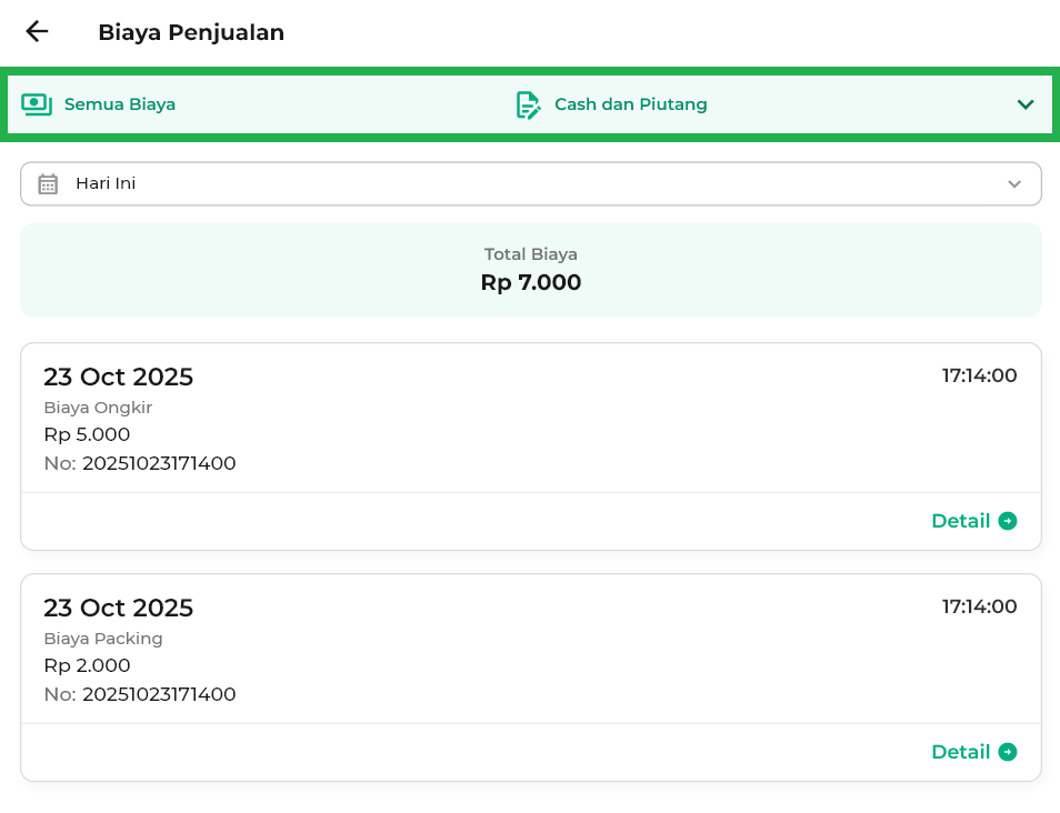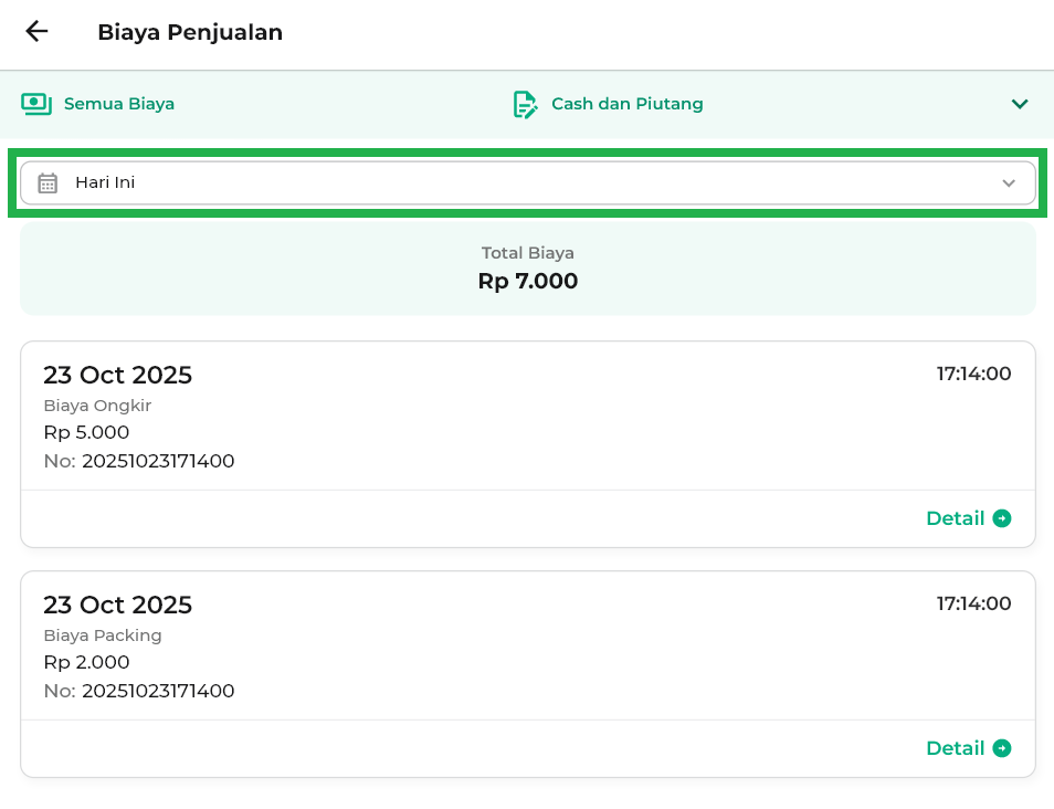 - Hari Ini: menampilkan biaya penjualan hari ini.