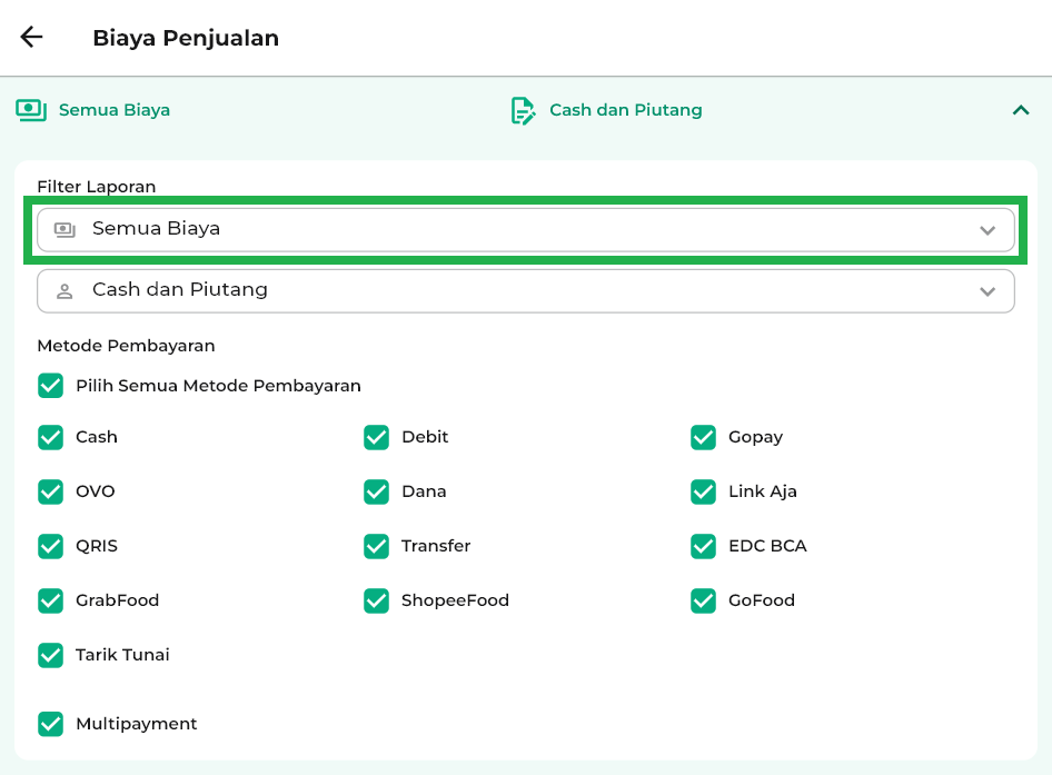 6. Pada bagian Filter Laporan, pilih jenis biaya yang ingin ditampilkan.