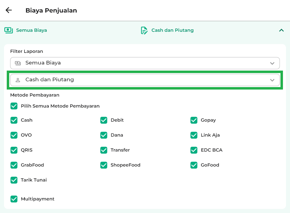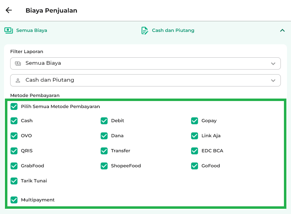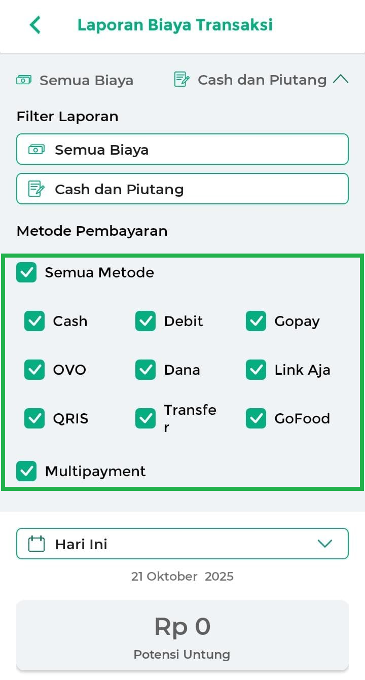 5. Gunakan filter yang tersedia, seperti filter Biaya, Cara Pembayaran (Cash dan Piutang), dan Metode Pembayaran, untuk menyesuaikan tampilan data sesuai kebutuhan.