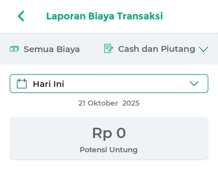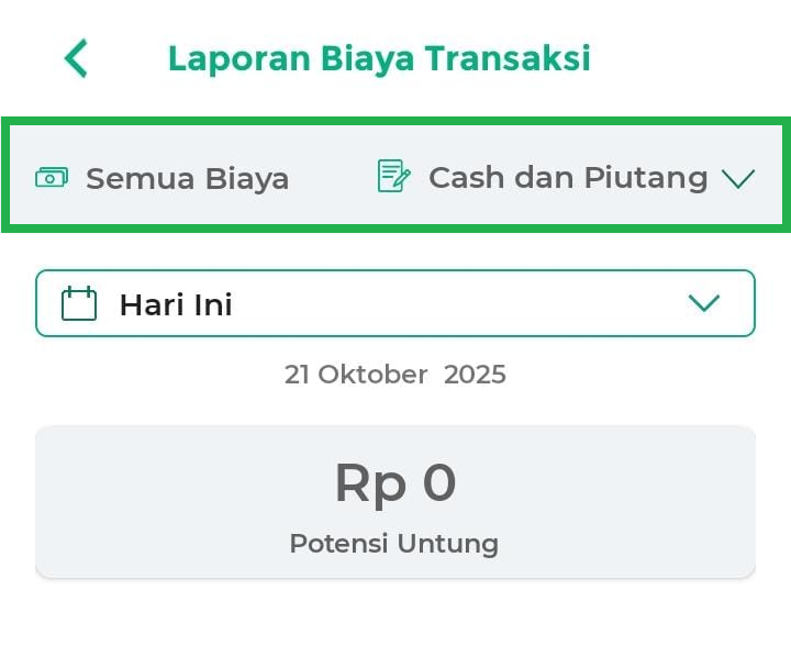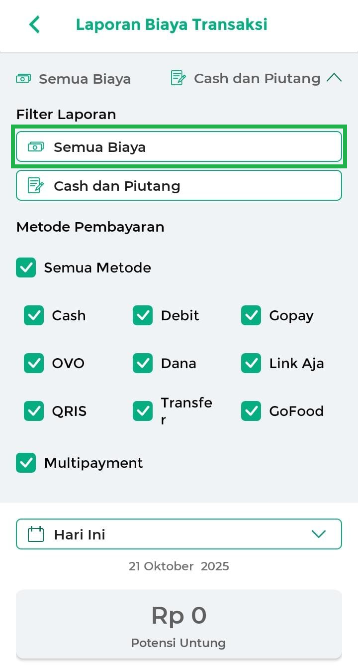 - Hari Ini: menampilkan laporan biaya transaksi hari ini.