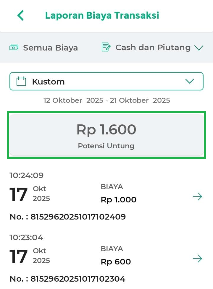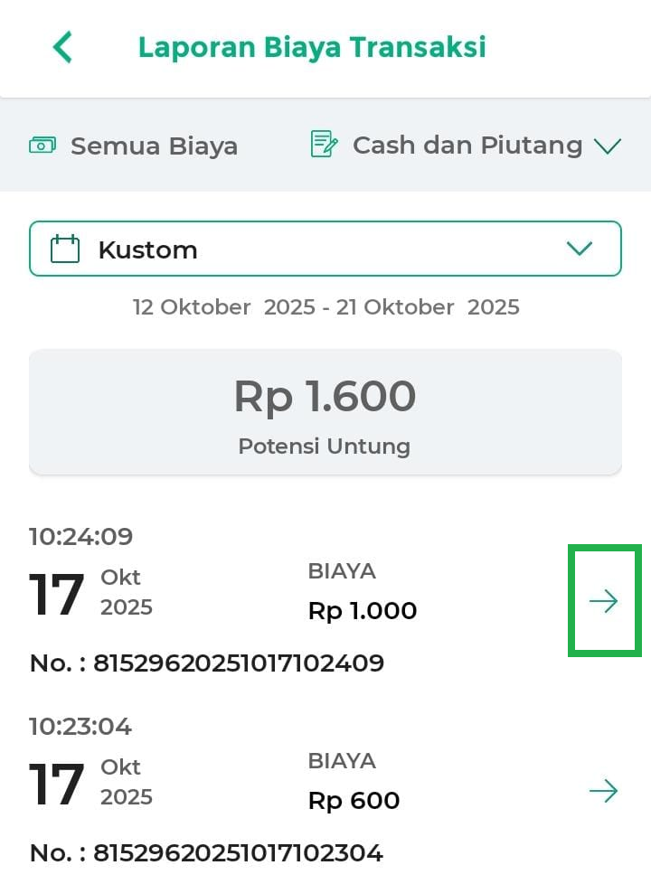 - Kemarin: menampilkan laporan biaya transaksi kemarin.