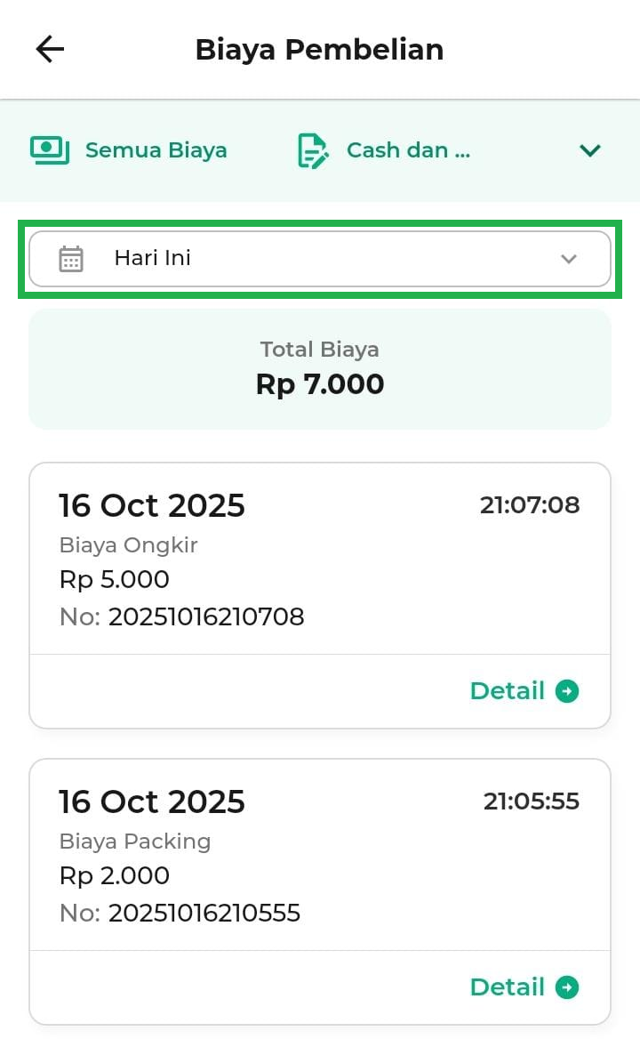 - Hari Ini: menampilkan biaya pembelian hari ini.