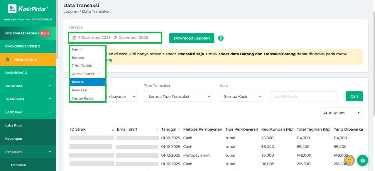 - Pada halaman Laporan Data Transaksi, Anda dapat melakukan penyaringan data berdasarkan tanggal atau periode waktu yang diinginkan.