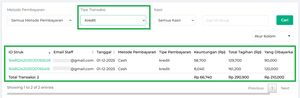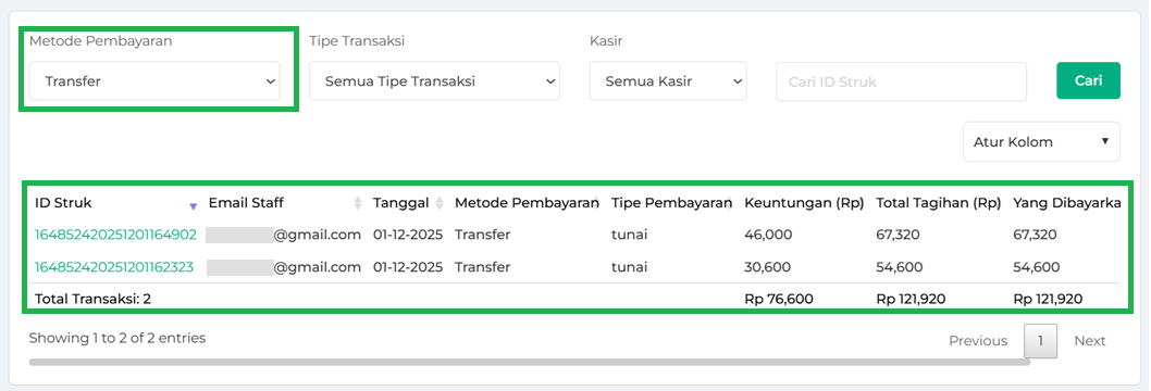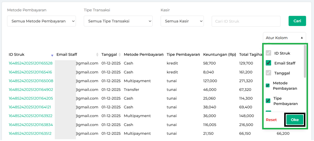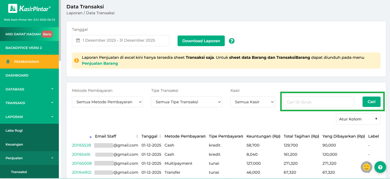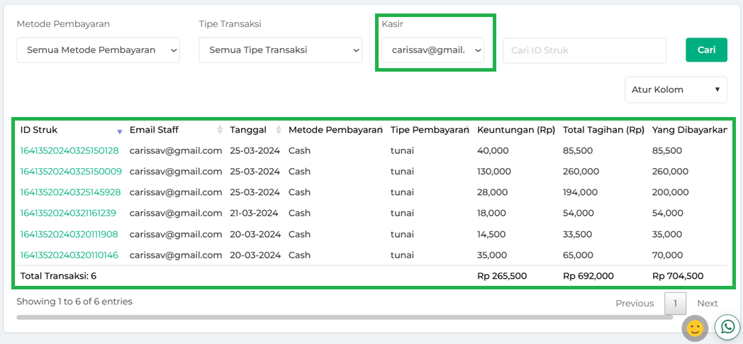 Sebagai contoh, Karis ingin melihat data transaksi berdasarkan email kasir carissav@gmail.com.