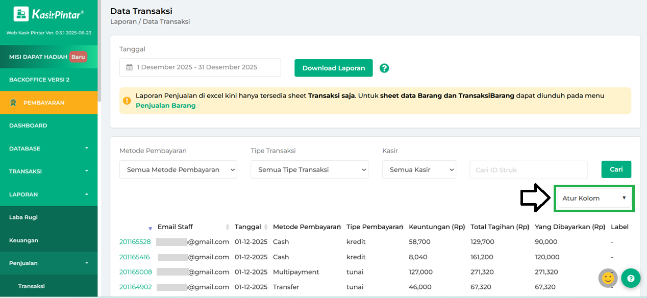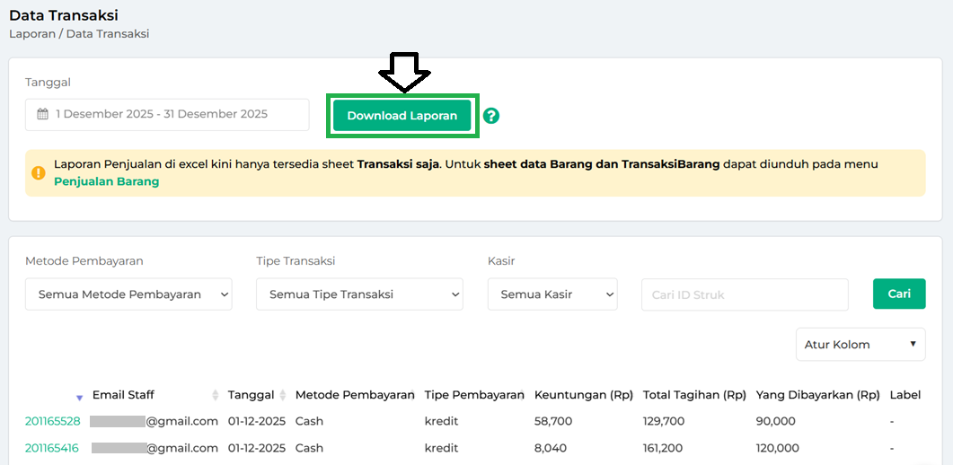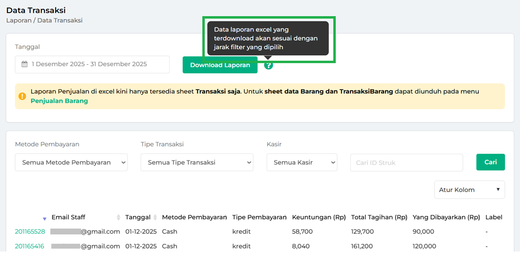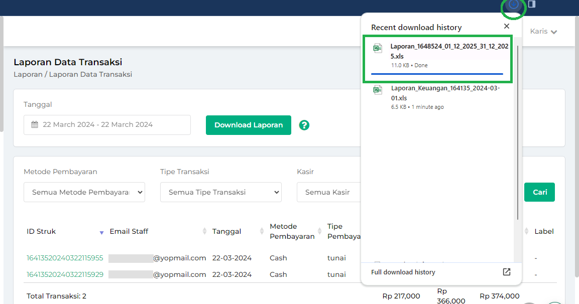 Ketika tombol download di klik, laporan data transaksi akan otomatis terunduh dan tersimpan di perangkat yang Anda gunakan.