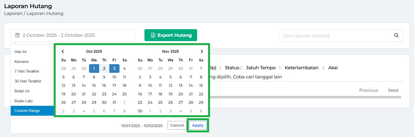 4. Anda bisa mengatur periode waktu dalam Laporan Hutang dengan kategori berikut: