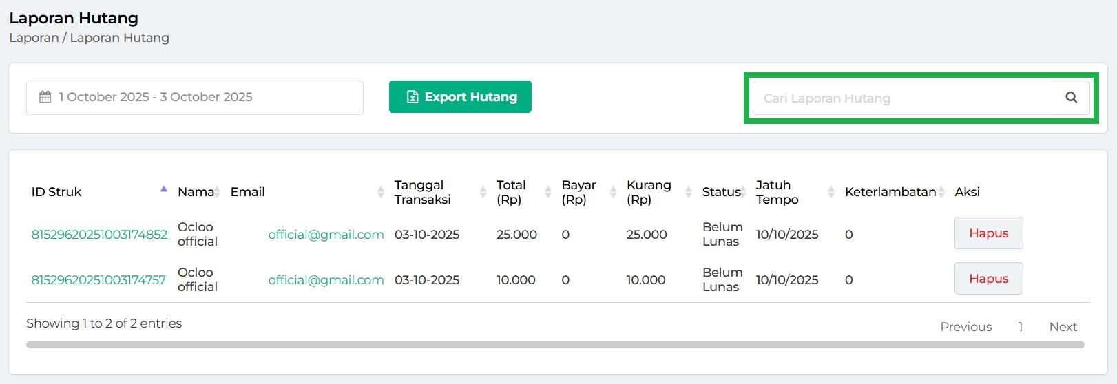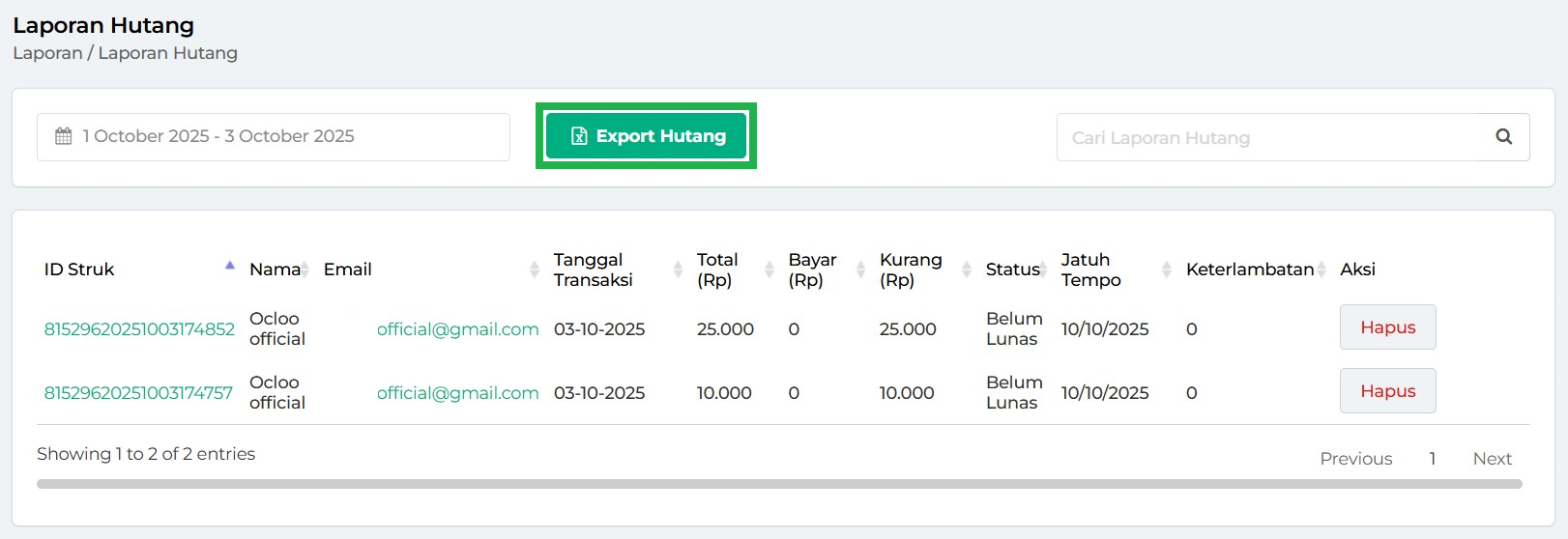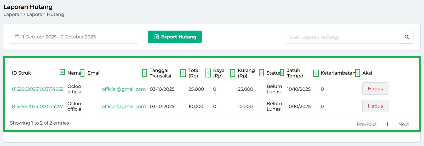 7. Data Laporan Hutang akan otomatis ditampilkan pada tabel berdasarkan periode waktu yang telah Anda pilih.