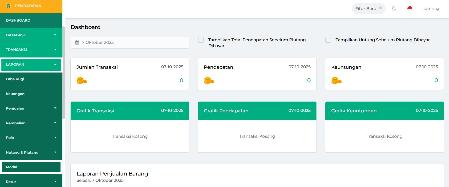 2. Pilih menu Laporan, lalu klik opsi Modal.