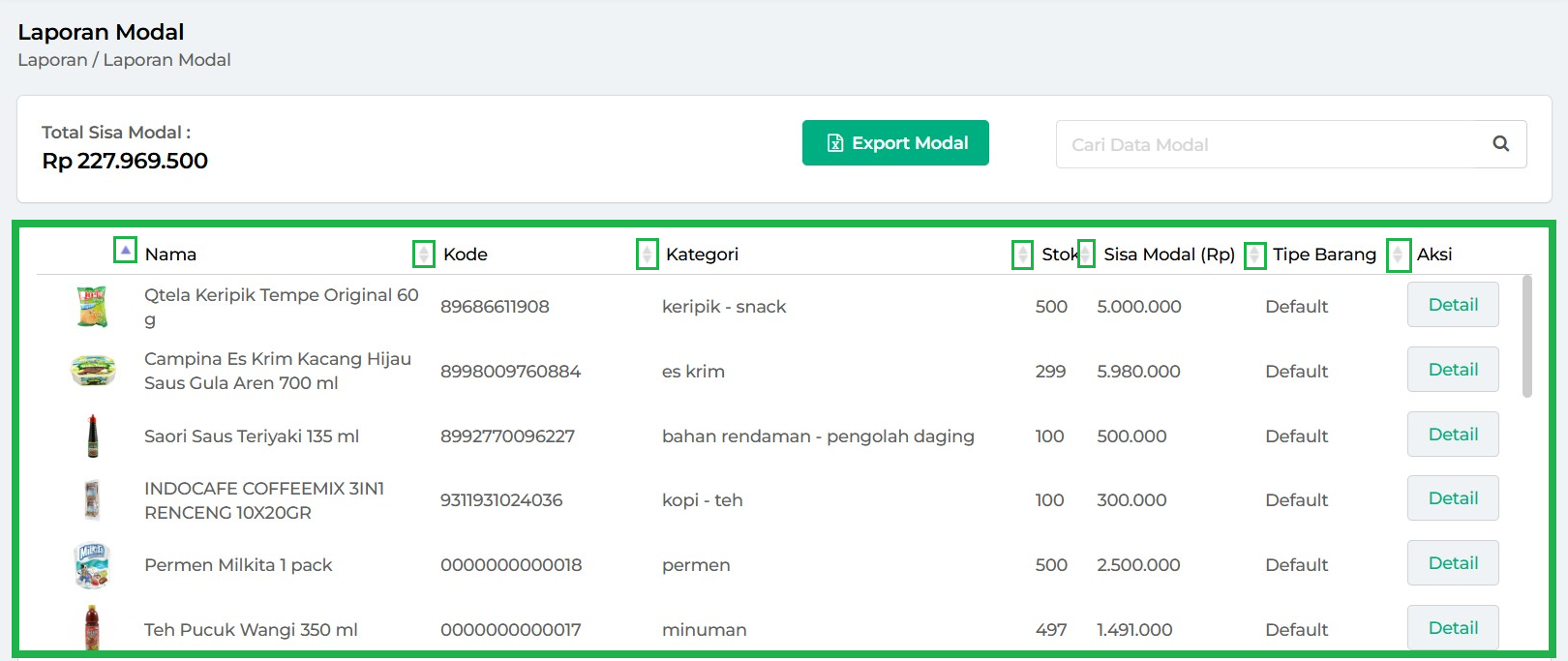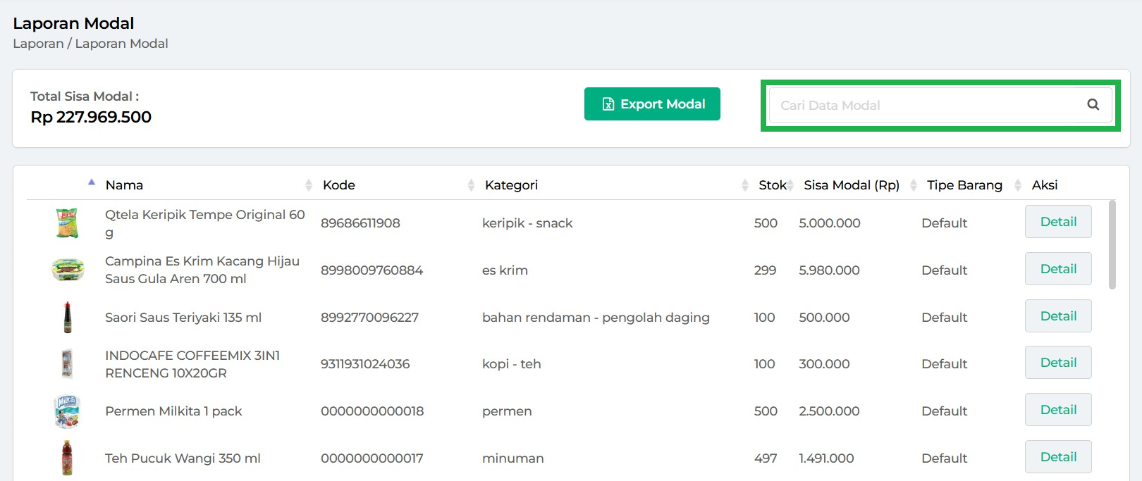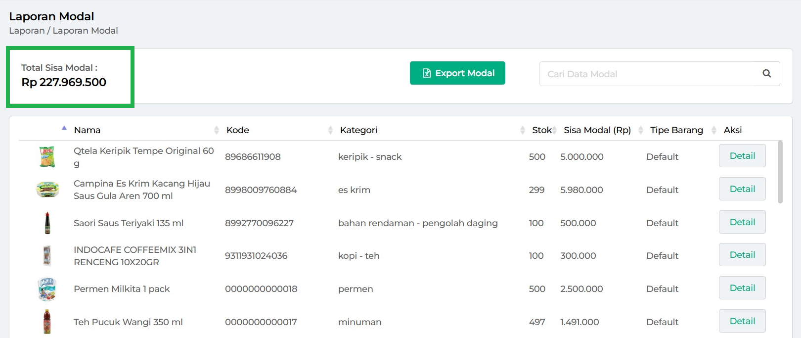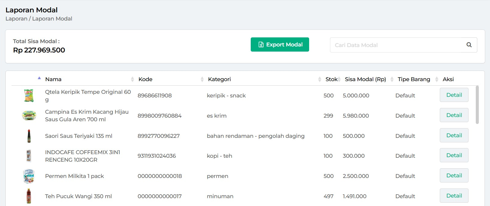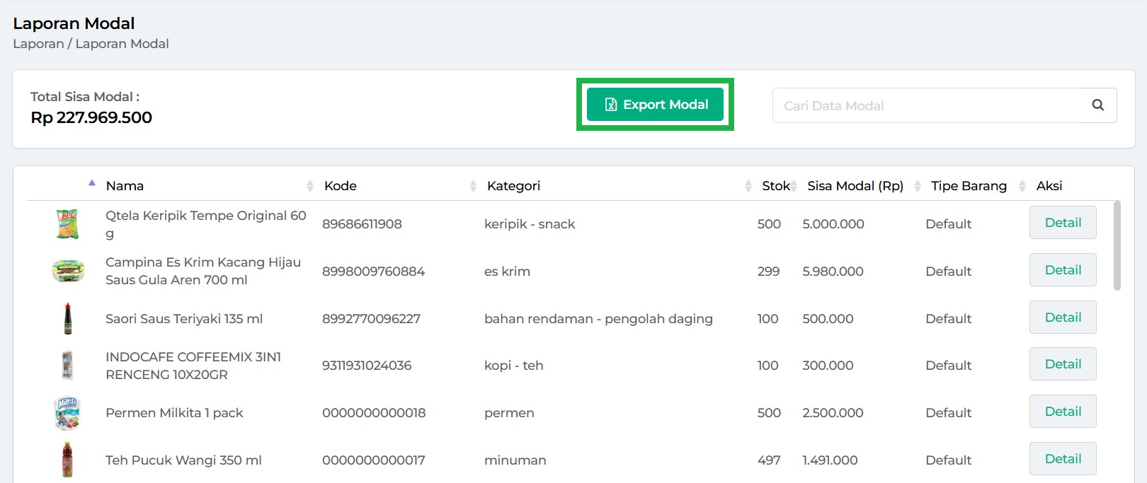 5. Klik tombol Export Modal untuk mengunduh laporan modal. Fitur ini membantu Anda melakukan rekap atau analisis modal secara lebih detail.