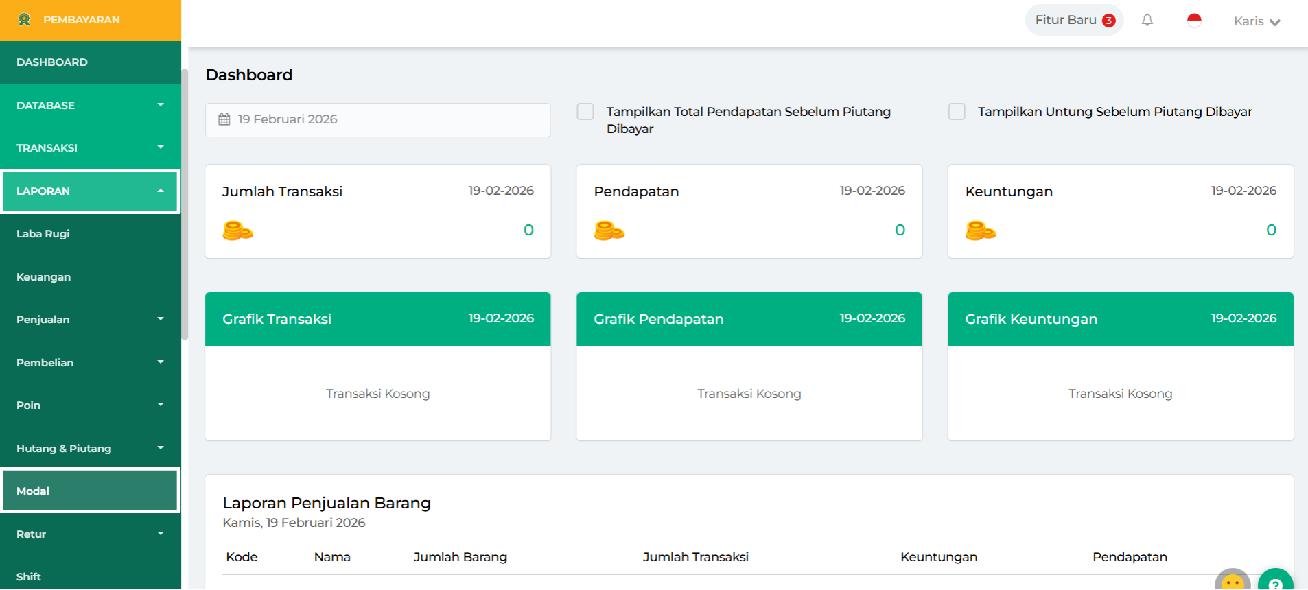 2. Pilih menu Laporan, lalu klik opsi Modal.