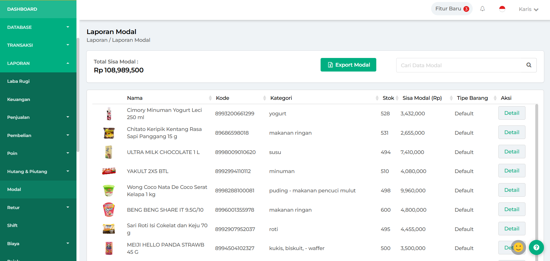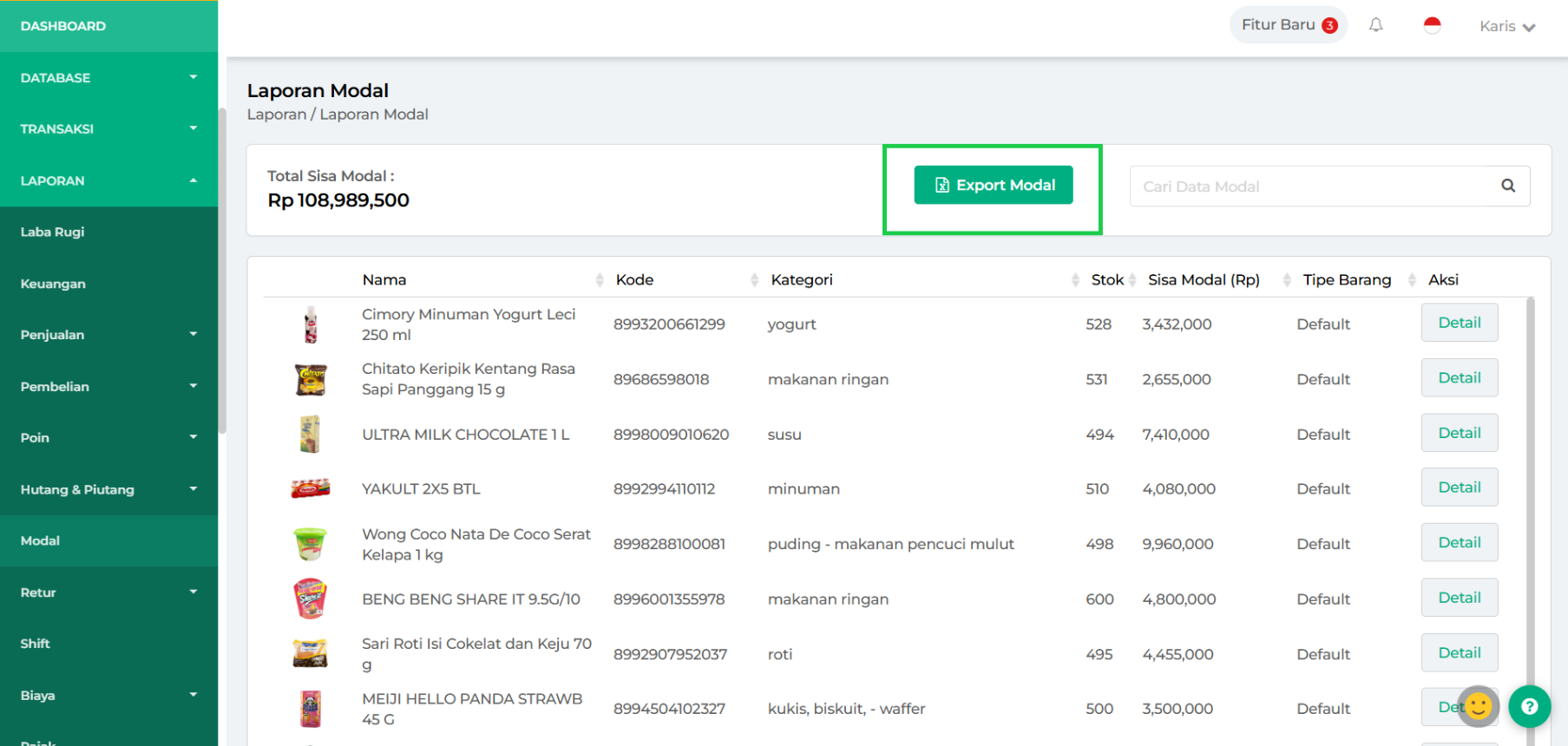 5. Klik tombol Export Modal untuk mengunduh laporan modal. Fitur ini membantu Anda melakukan rekap atau analisis modal secara lebih detail.