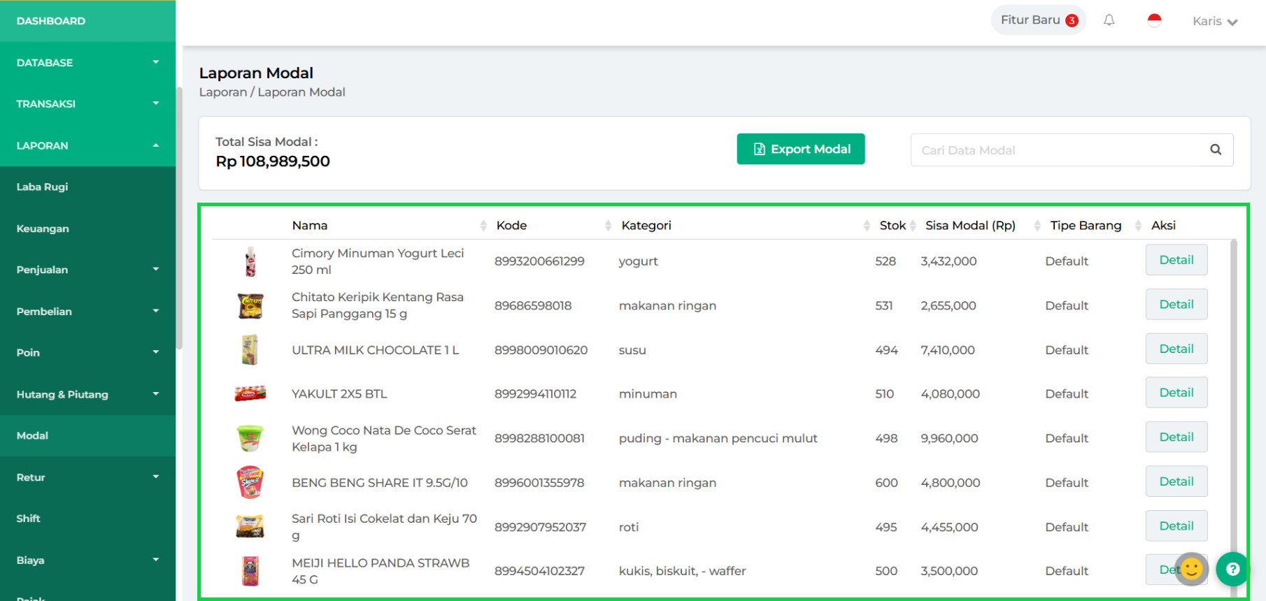 4. Bagian ini menampilkan jumlah total keseluruhan modal yang masih tersisa berdasarkan seluruh stok barang yang ada di sistem.