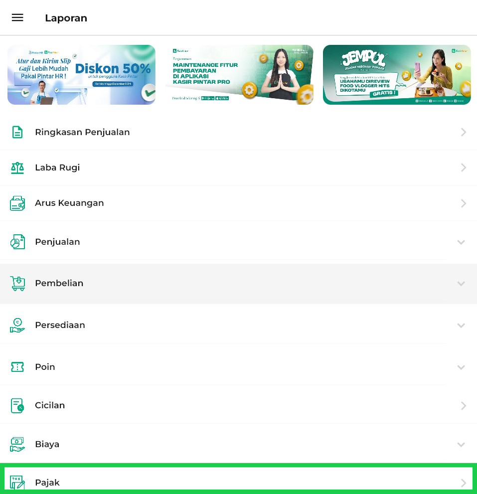Panduan berikut akan menjelaskan langkah-langkah untuk mengakses dan menggunakan fitur Laporan Pajak melalui Kasir Pintar Pro, Kasir Pintar Dashboard (iOS & Desktop), serta Website/Back Office.