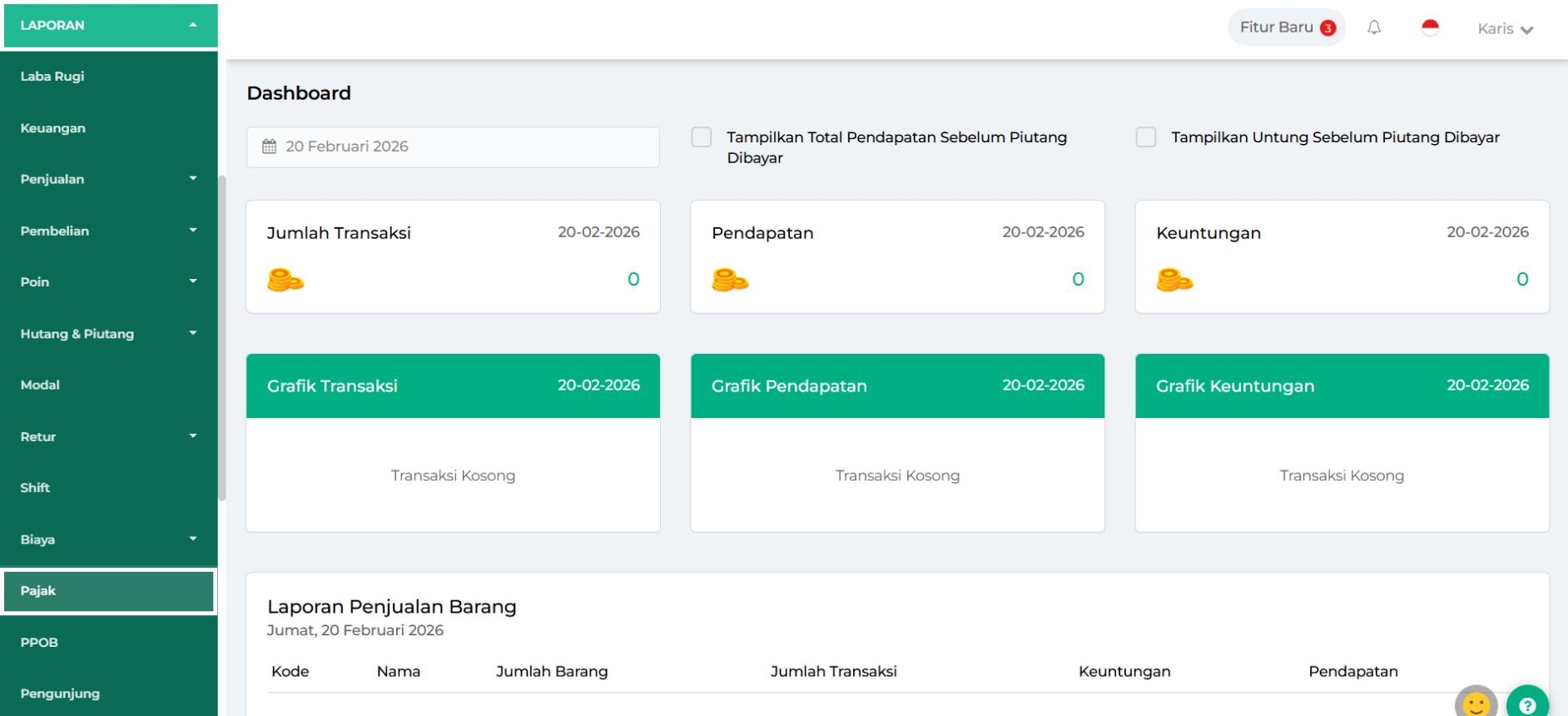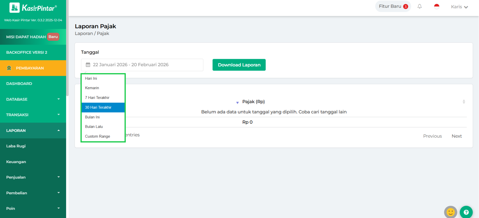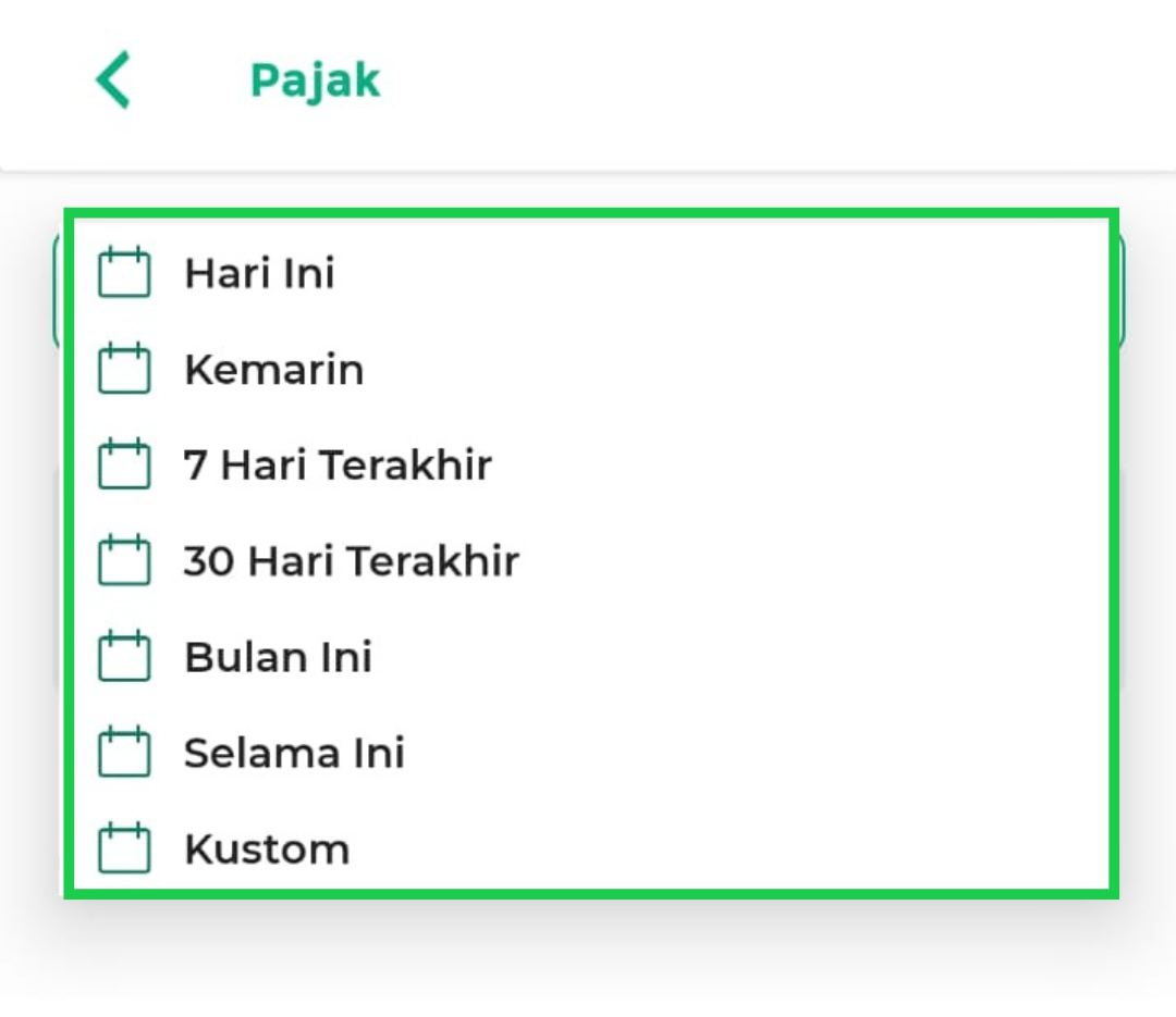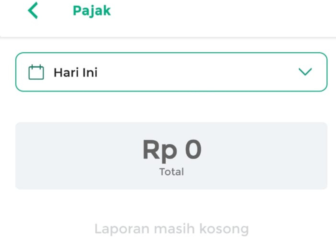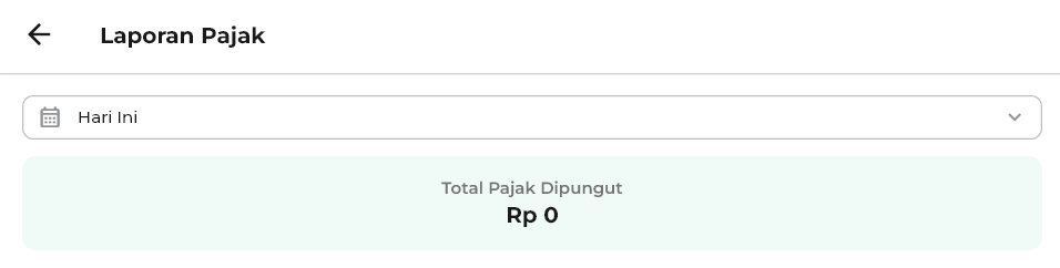 - Hari Ini: menampilkan laporan pajak hari ini.