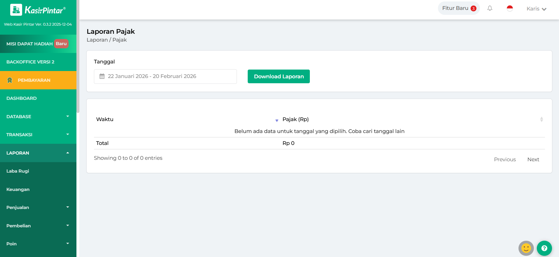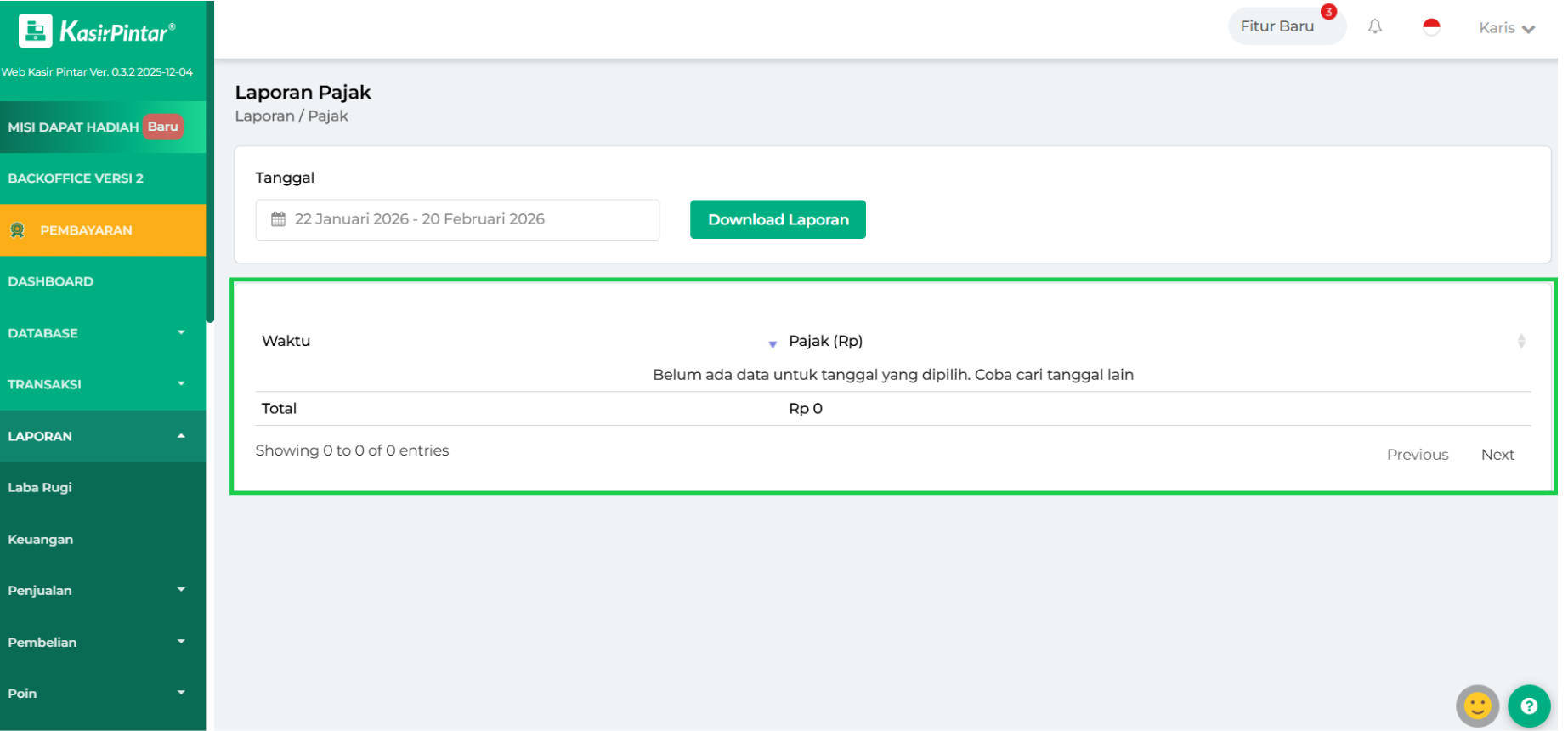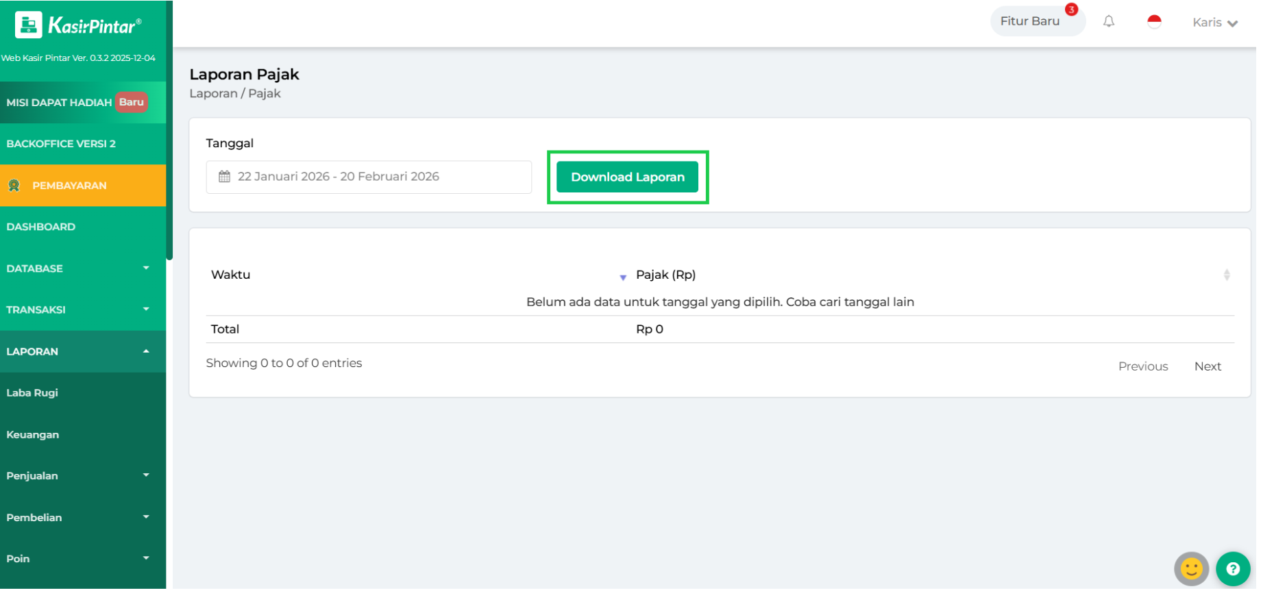 - Hari Ini: menampilkan laporan pajak hari ini.
