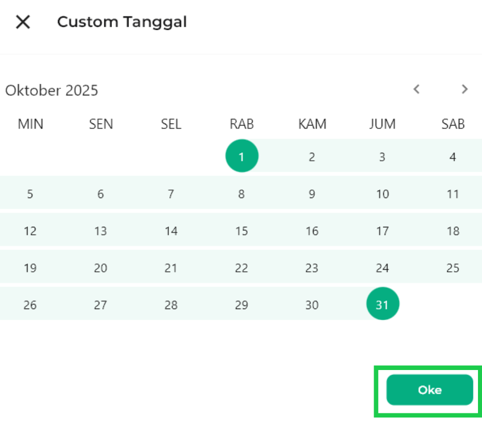 Jika Anda memilih Custom Tanggal, Anda dapat memilih jangka waktu periode berdasarkan keinginan Anda. Setelah itu klik OKE.