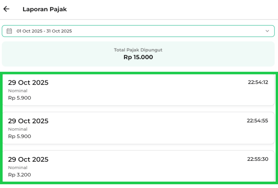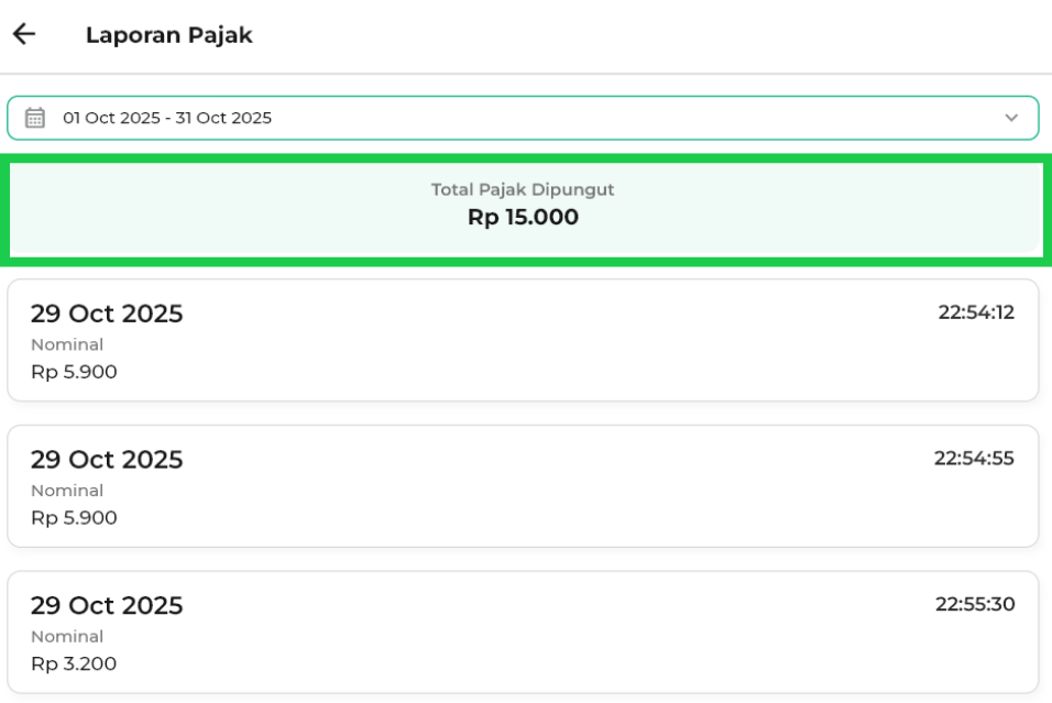 - 30 Hari Terakhir: menampilkan laporan pajak selama 30 hari.