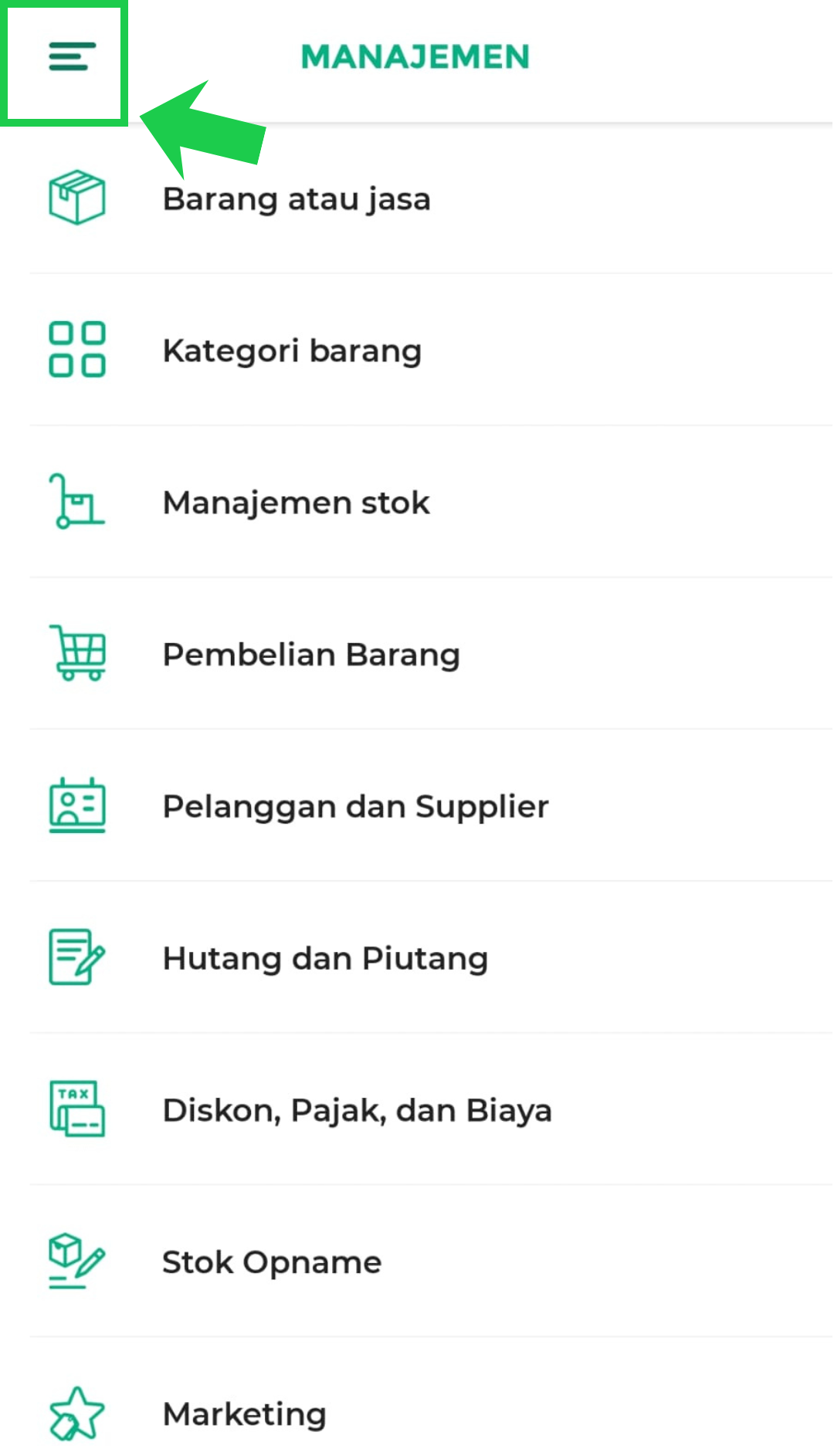 1. Buka aplikasi Kasir Pintar Pro atau Kasir Pintar Dashboard (iOS), lalu klik ikon garis tiga di pojok kiri atas untuk membuka menu sidebar.
