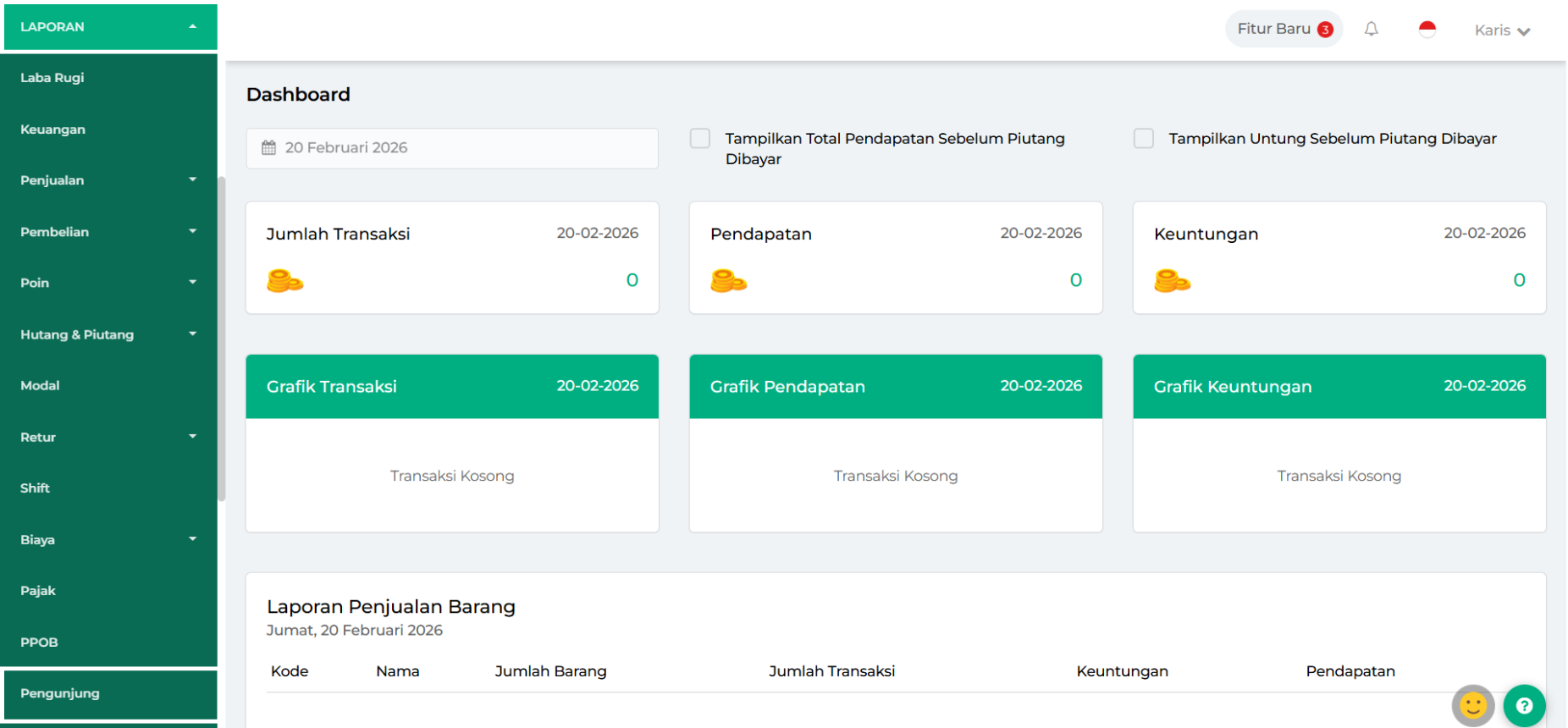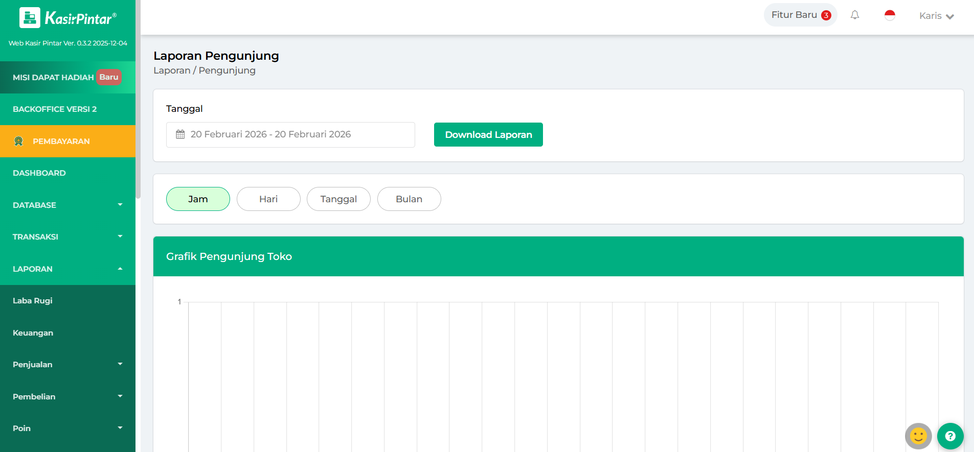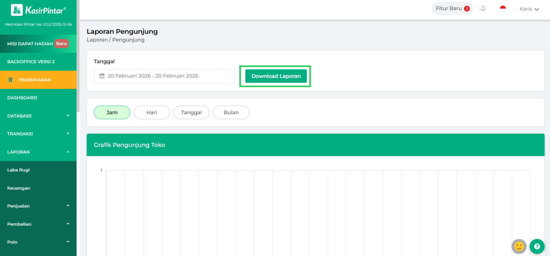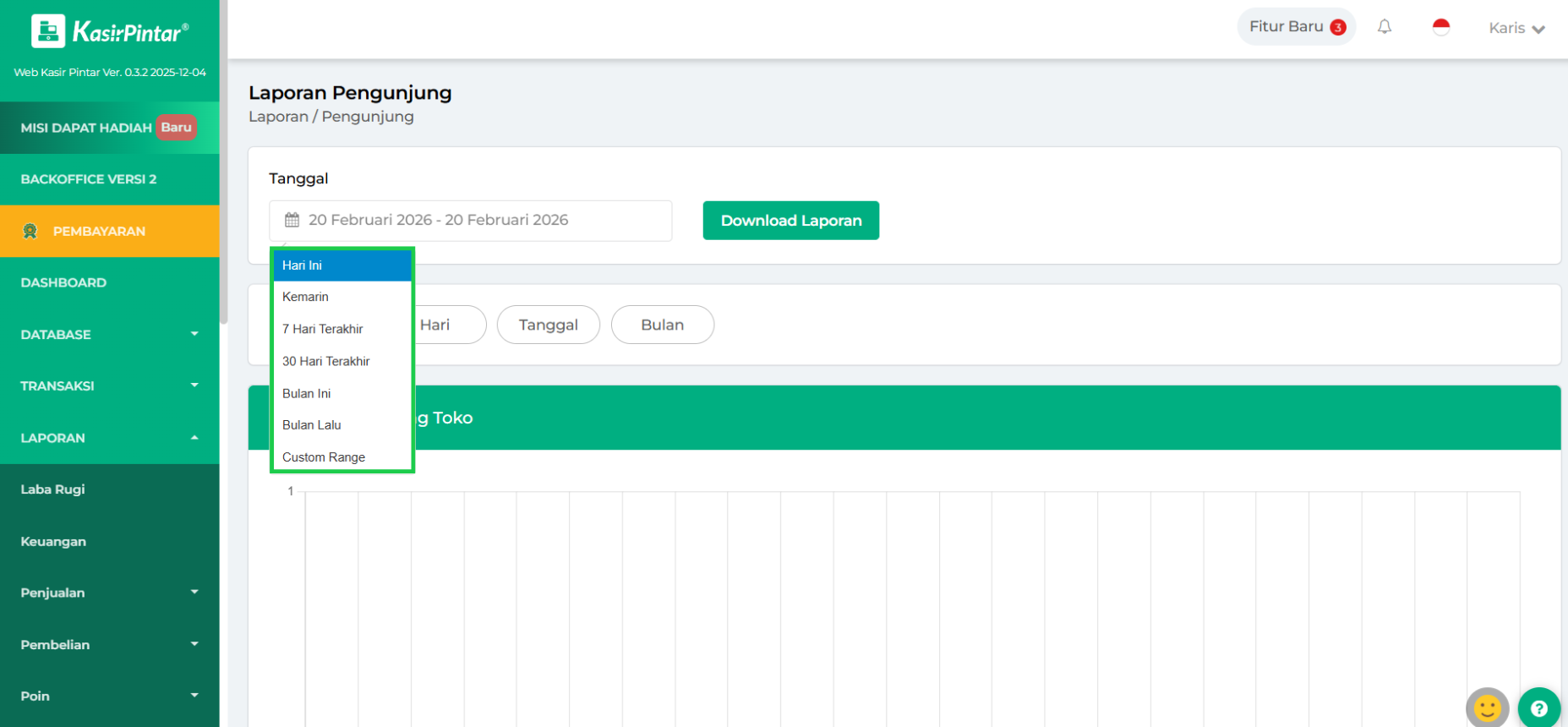 - Hari Ini: menampilkan laporan pengunjung hari ini.