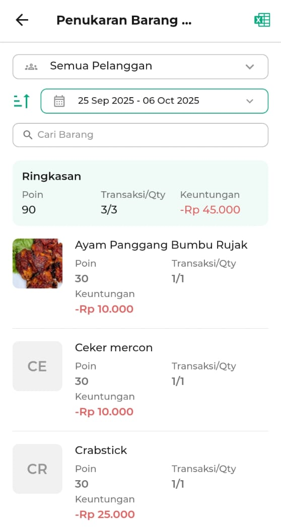 Dengan fitur Laporan Penukaran Barang Berpoin, Anda dapat memantau seluruh aktivitas penukaran poin pelanggan secara lebih terstruktur. Semua data mulai dari total poin yang digunakan, jumlah transaksi, hingga nilai keuntungan dapat Anda akses dalam satu tampilan.