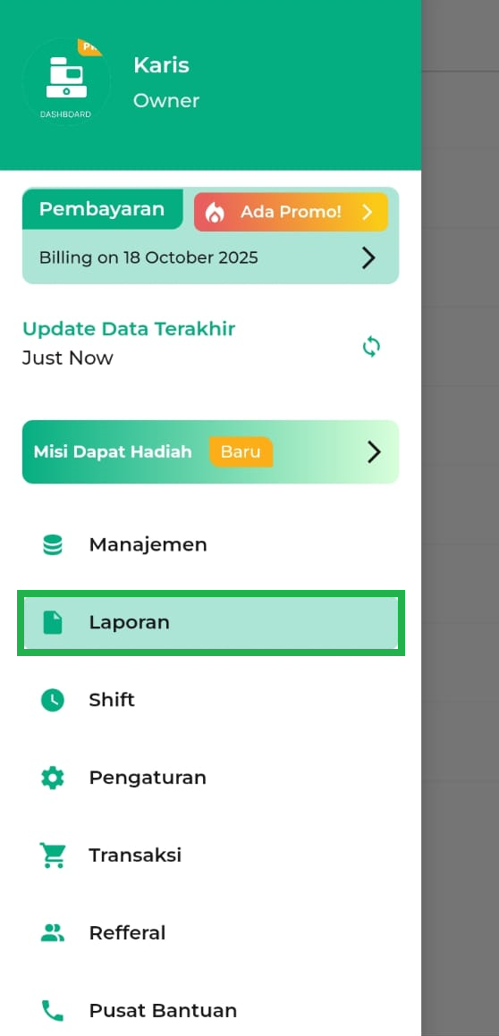 1. Buka aplikasi Kasir Pintar Pro dan klik ikon garis tiga di pojok kiri atas untuk membuka menu sidebar.