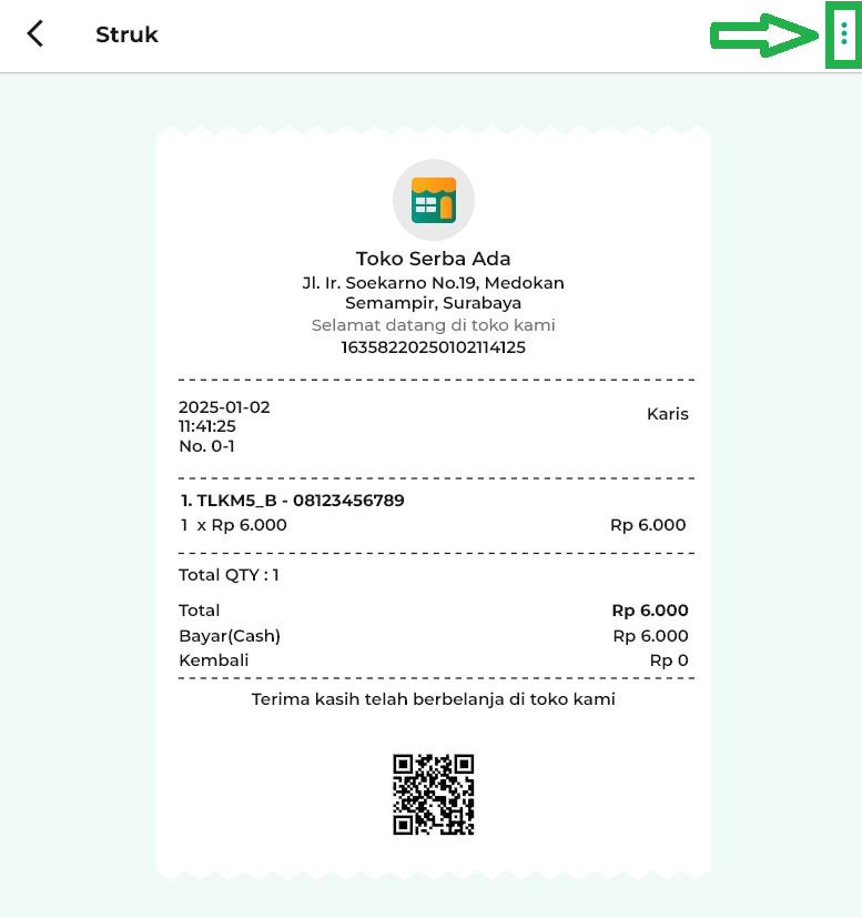 - Ikon titik tiga: Membuka opsi fitur tambahan, seperti mencetak, mengedit, atau melakukan retur struk.