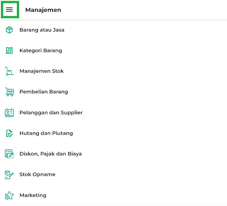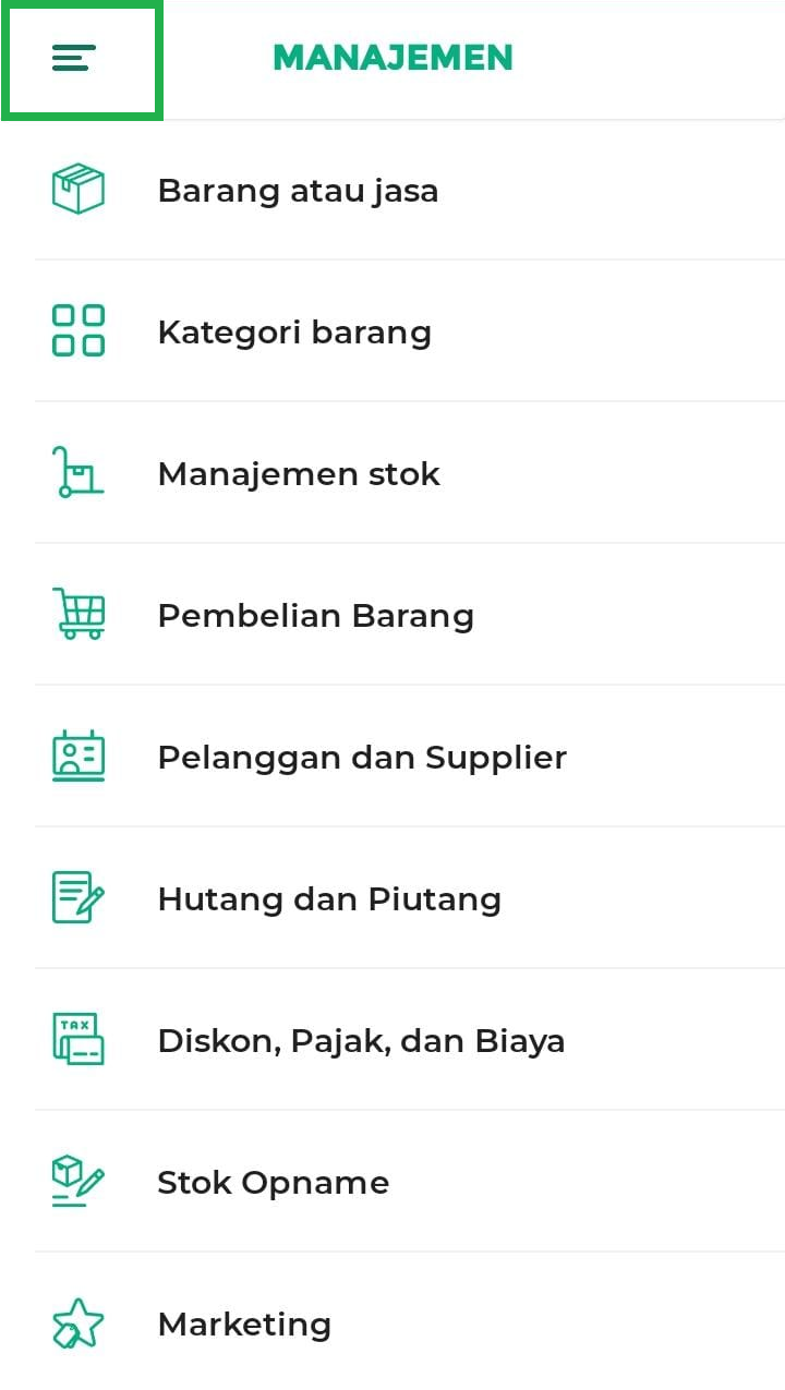1. Buka aplikasi Kasir Pintar Pro atau Kasir Pintar Dashboard (iOS), lalu klik ikon garis tiga di pojok kiri atas untuk membuka menu sidebar.