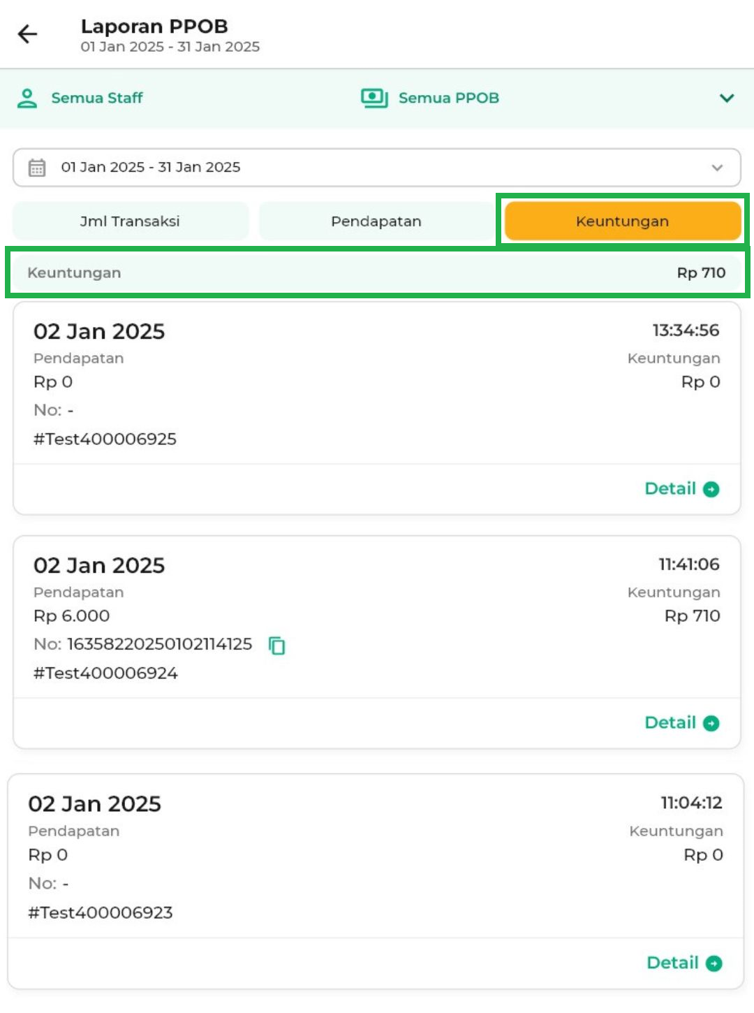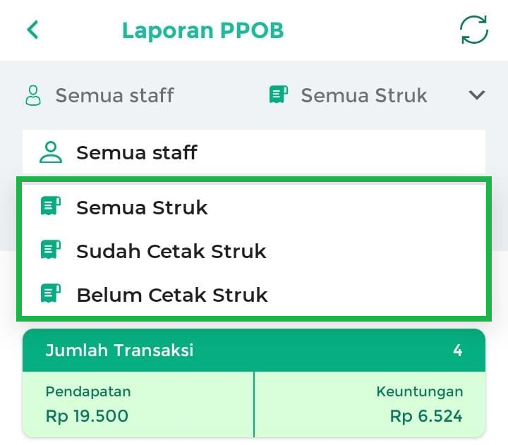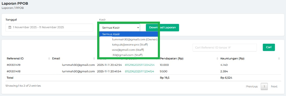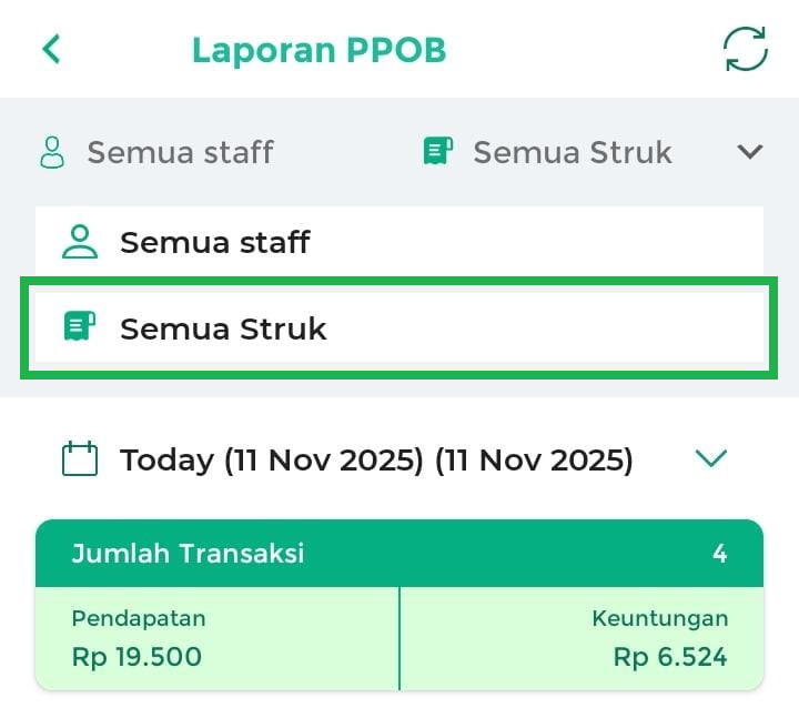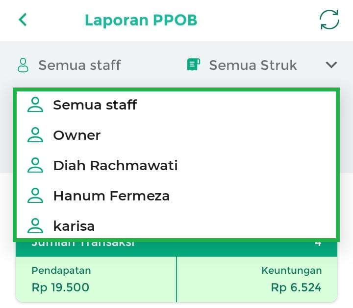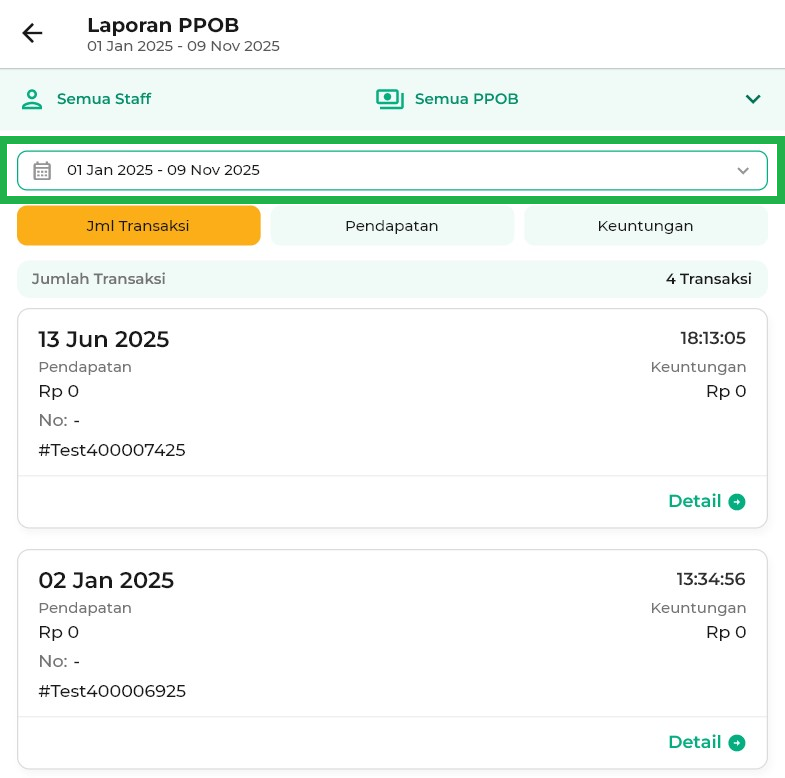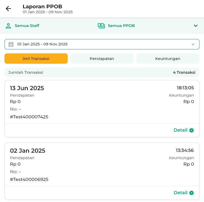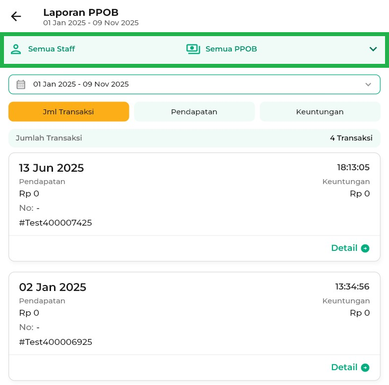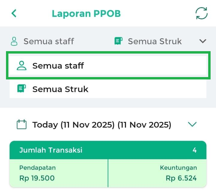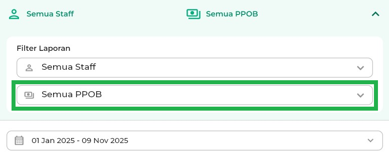 - Semua Staff: menampilkan laporan PPOB yang dilakukan oleh semua staff.