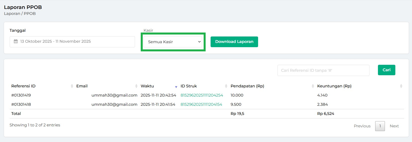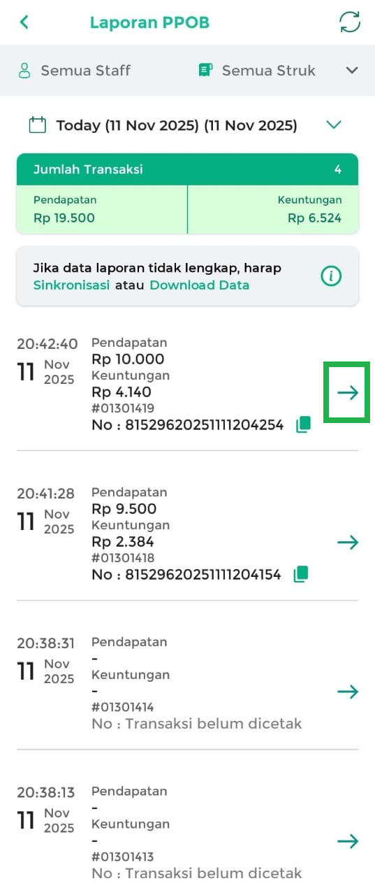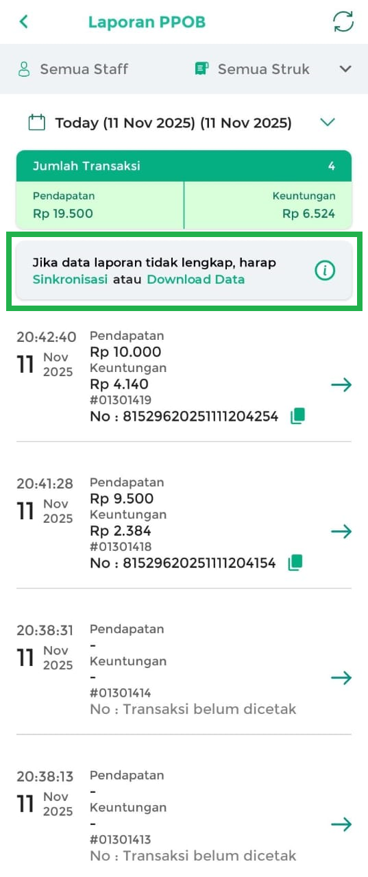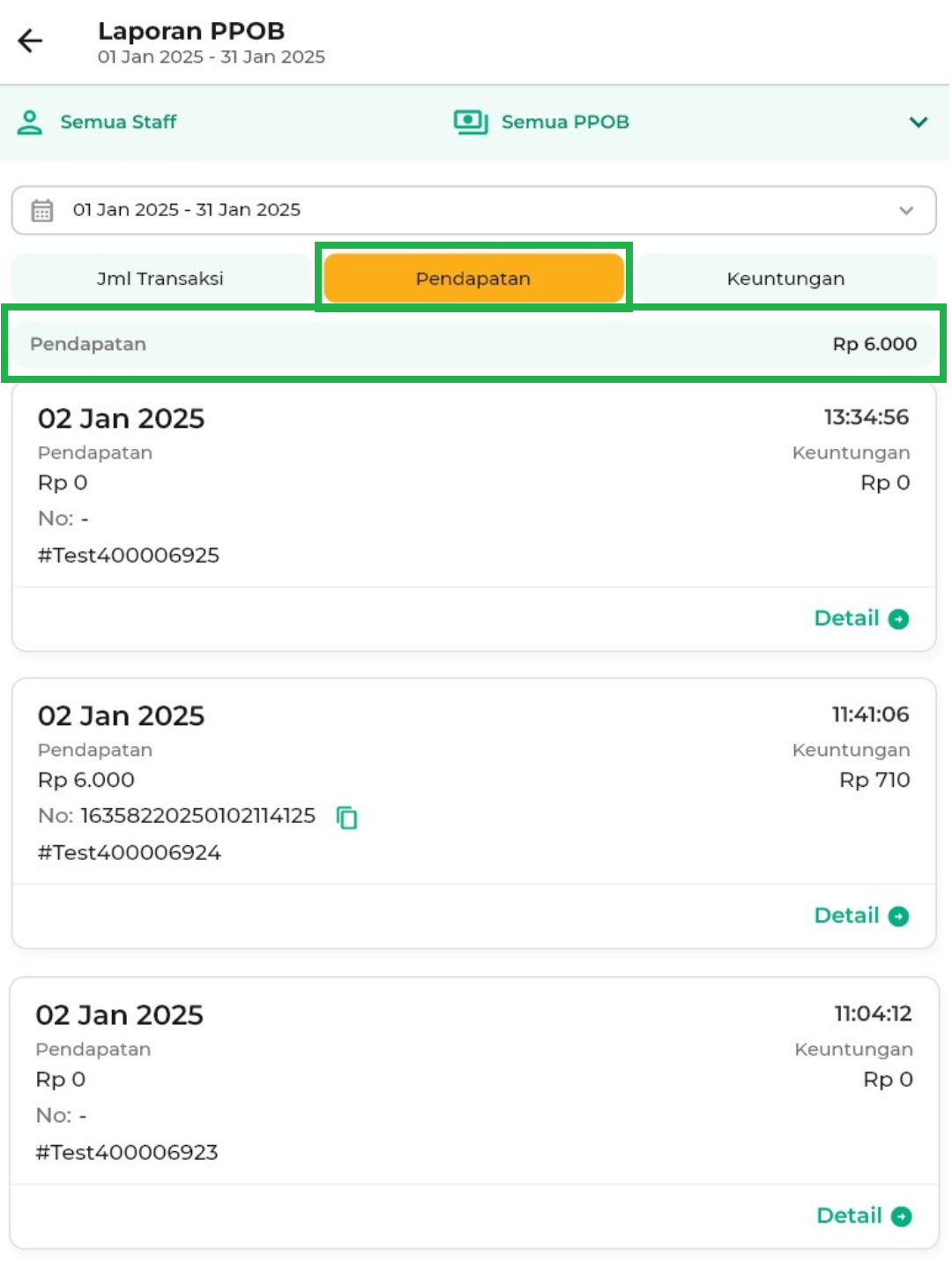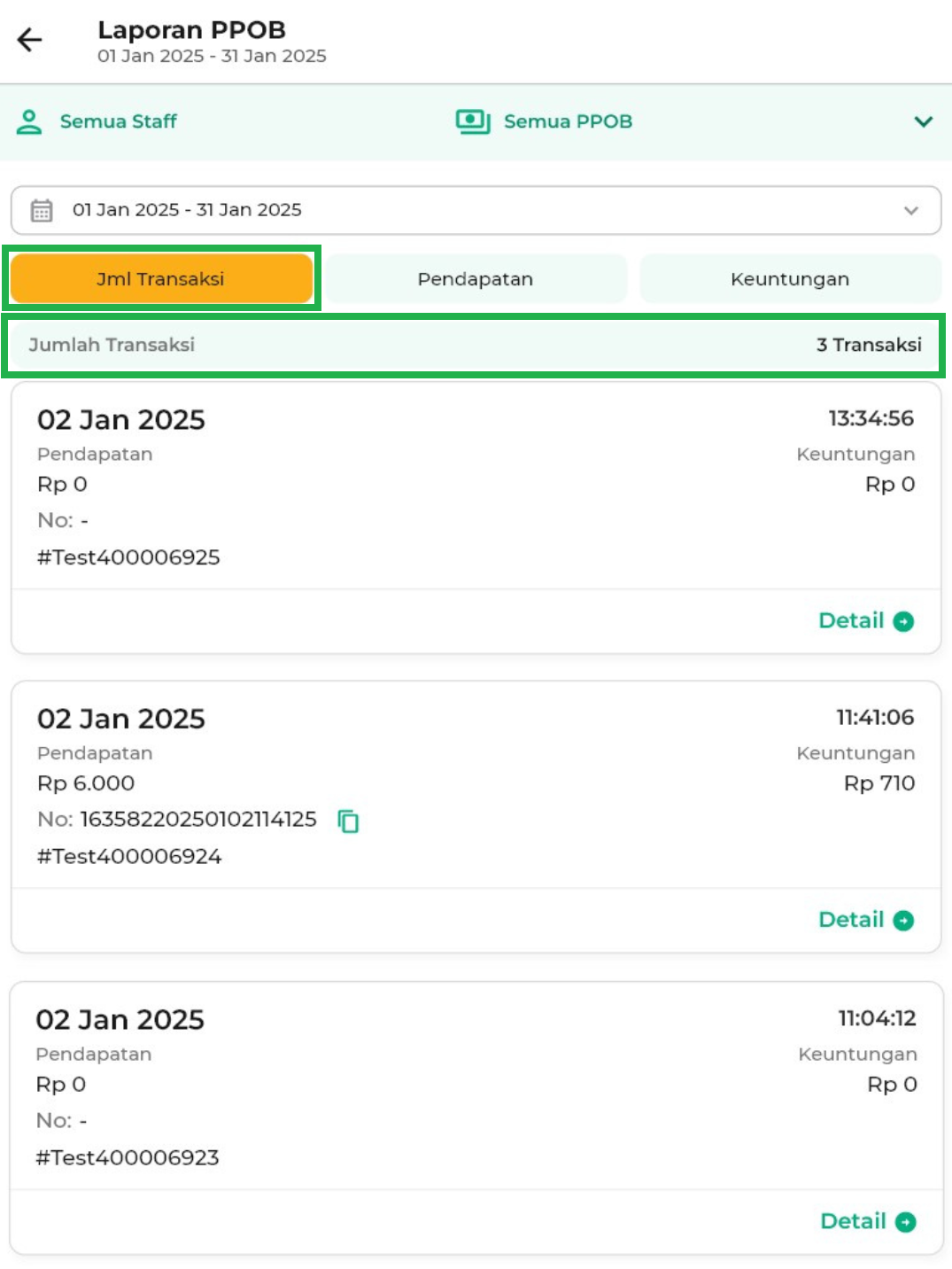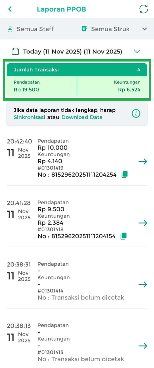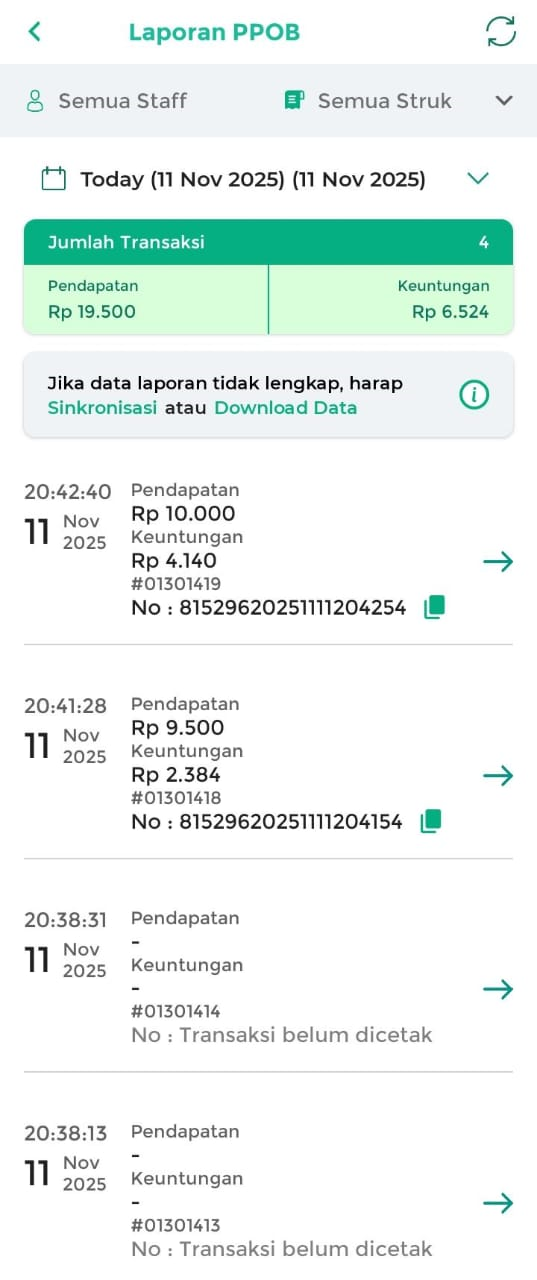 - Semua Staff: menampilkan laporan PPOB yang dilakukan oleh semua staff.