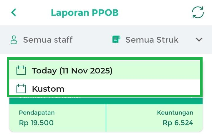 - Kustom: menampilkan laporan PPOB secara custom (pilih sesuai waktu yang diinginkan).