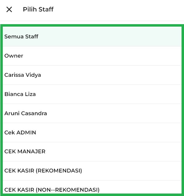 - Staff: pilih staff tertentu untuk menampilkan transaksi berdasarkan staff yang bertugas.