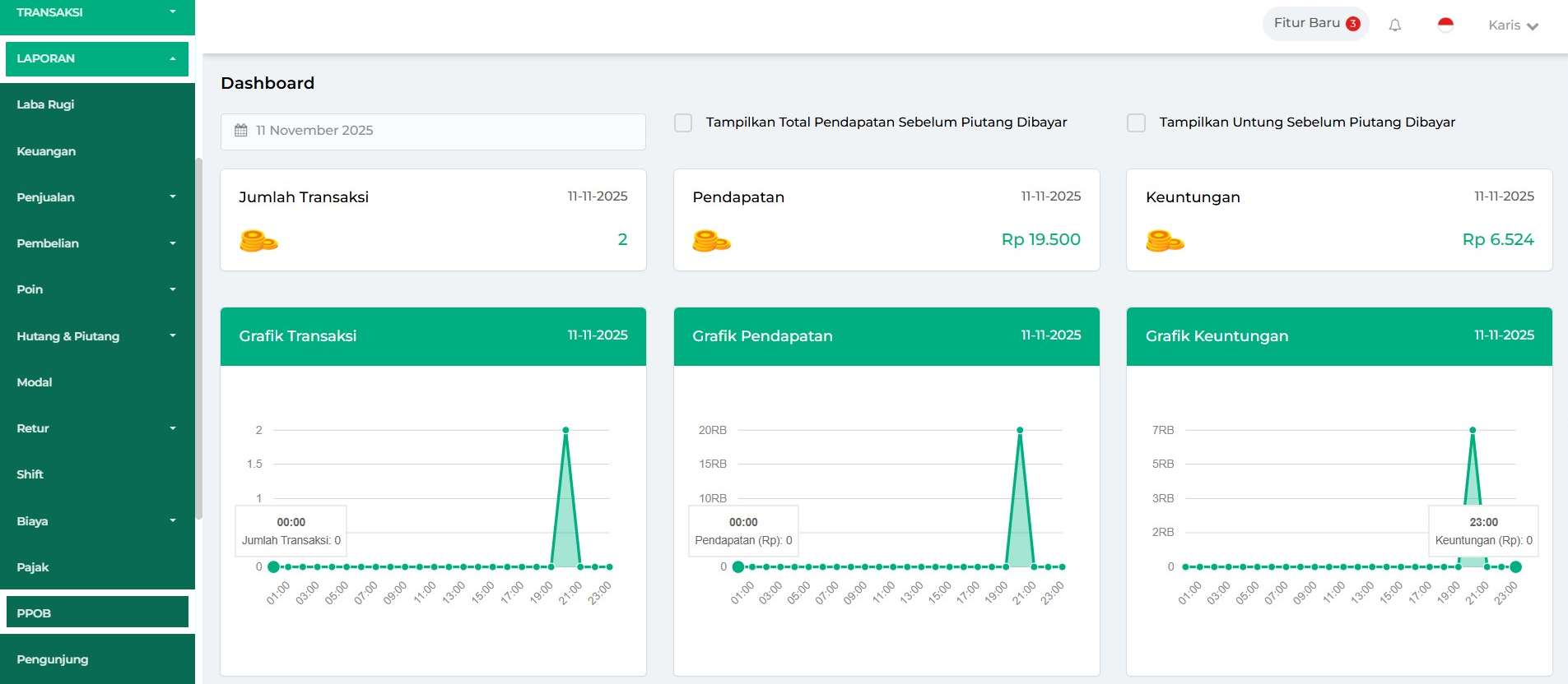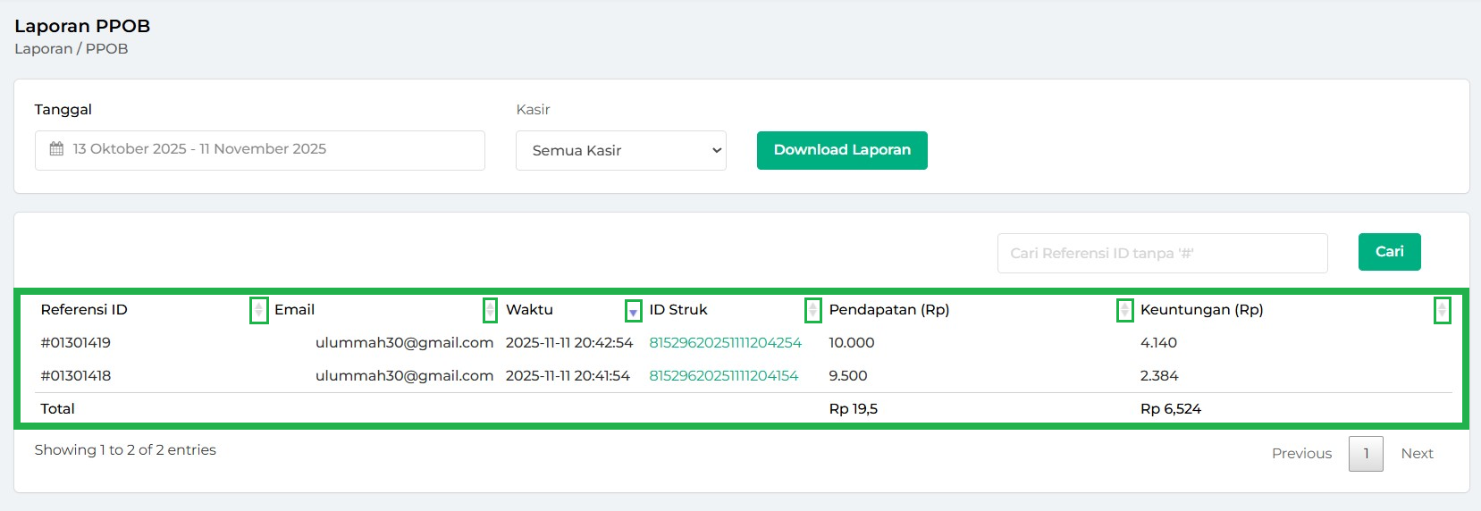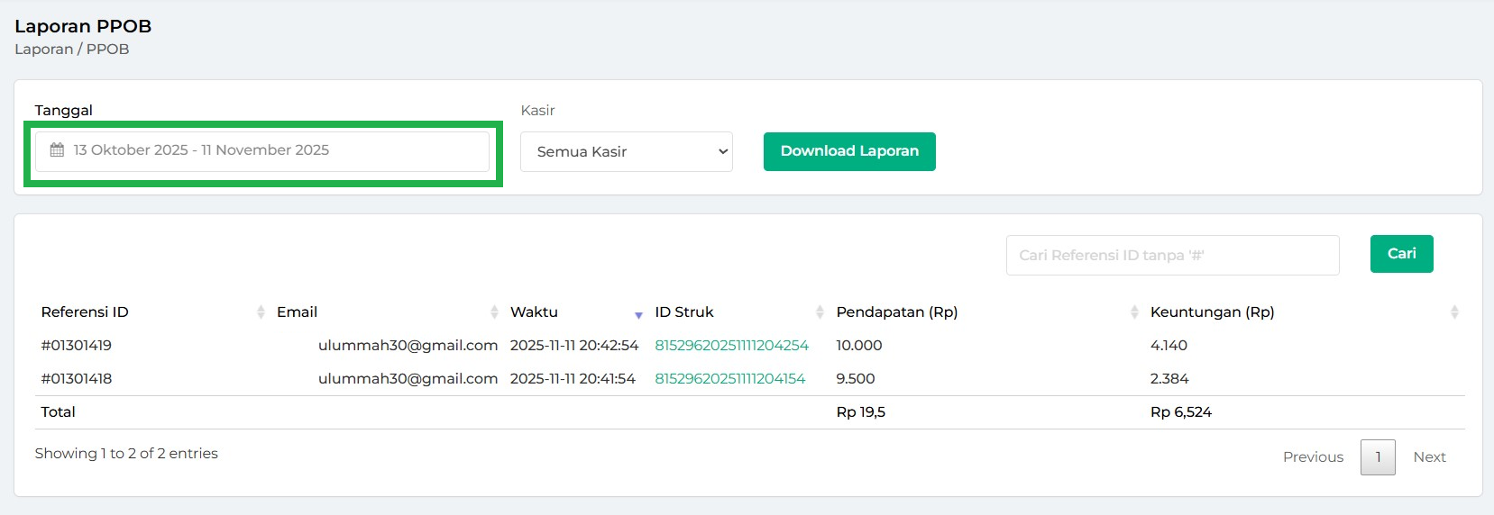 - Hari Ini: menampilkan laporan PPOB hari ini.