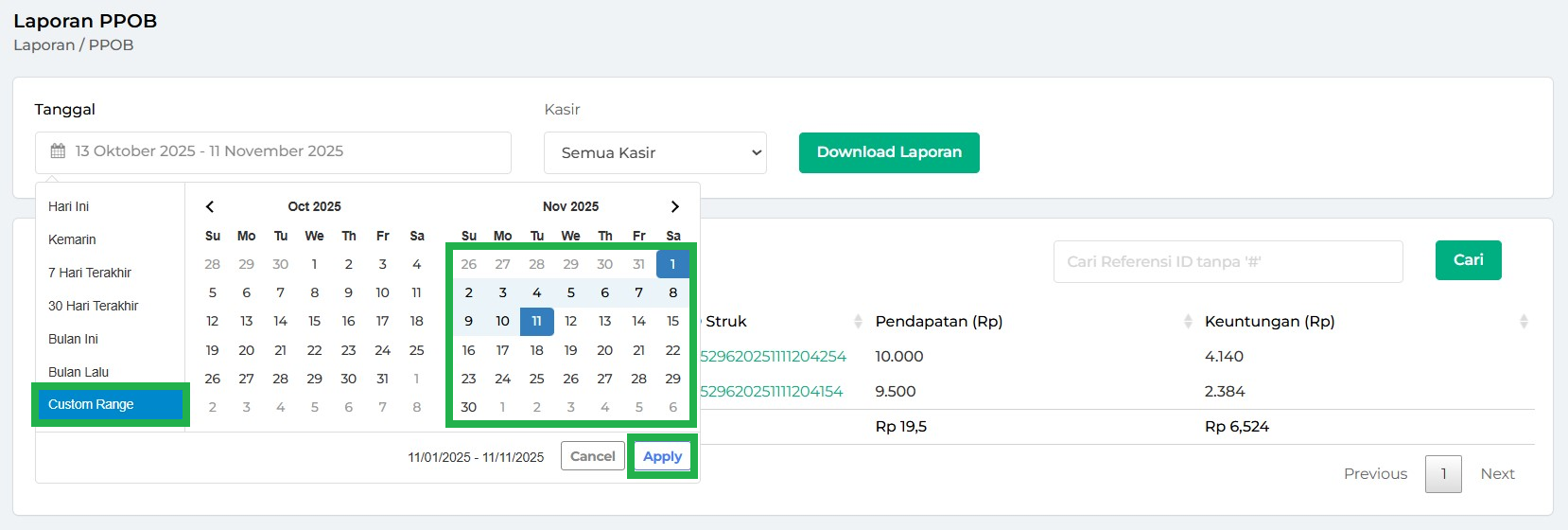 - Custom Tanggal: menampilkan laporan PPOB secara custom (pilih sesuai waktu yang diinginkan), setelah itu klik Apply agar rentang waktu dapat diterapkan.