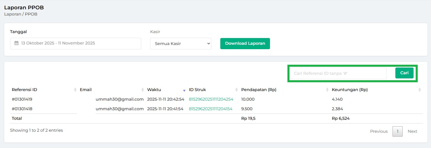 7. Anda dapat memanfaatkan pencarian laporan PPOBdengan klik Cari Referensi ID tanpa #.