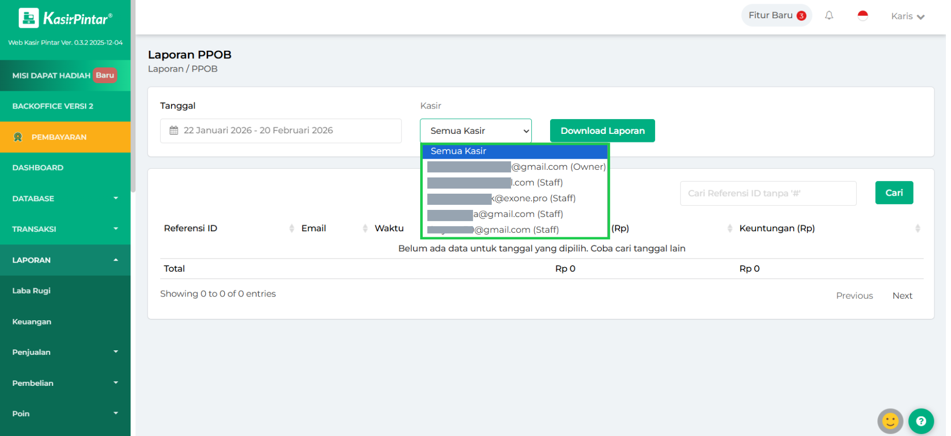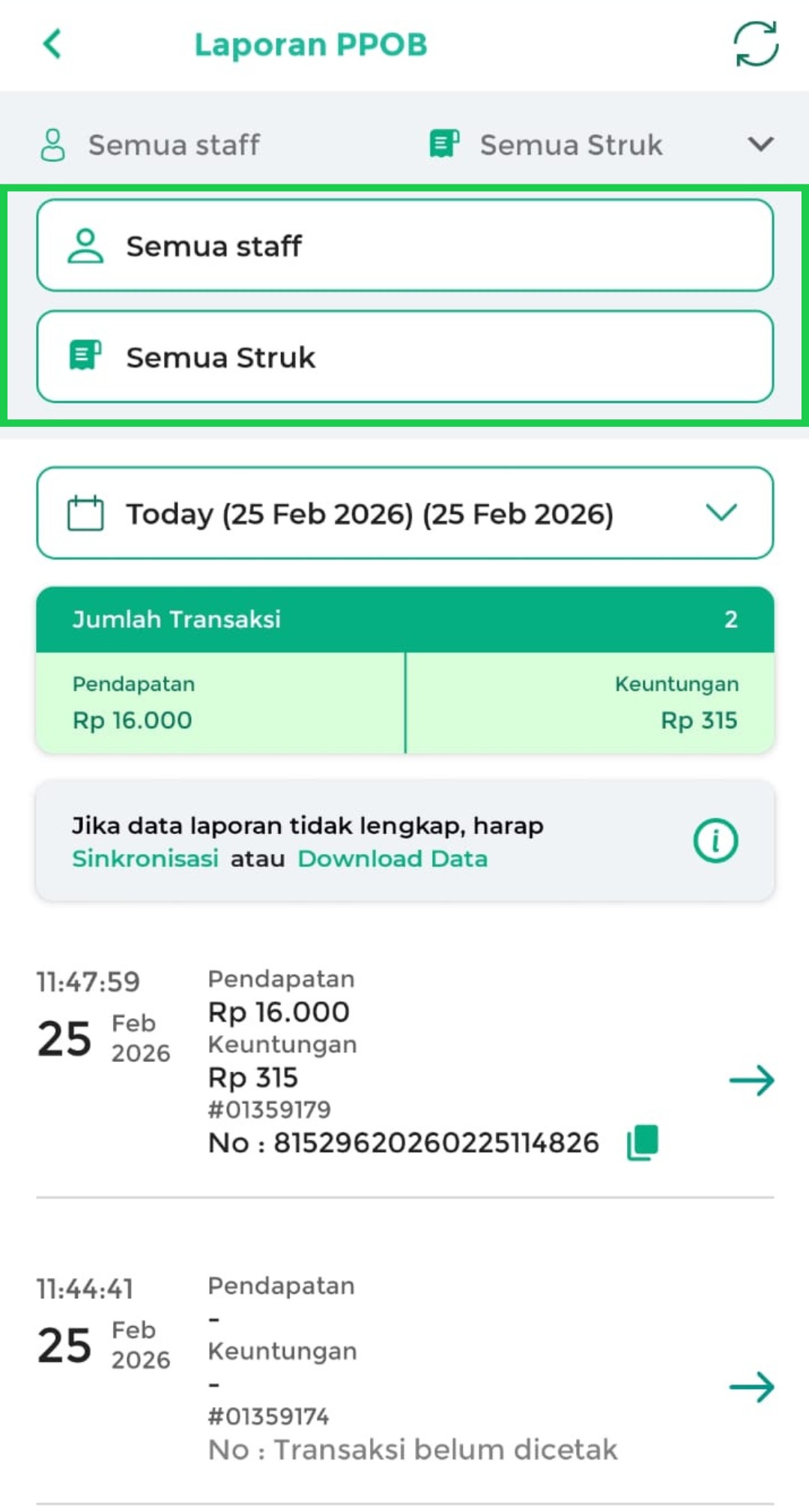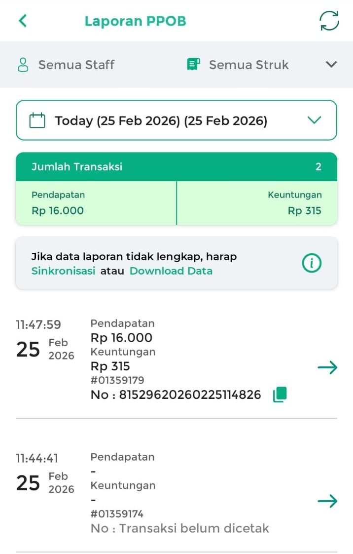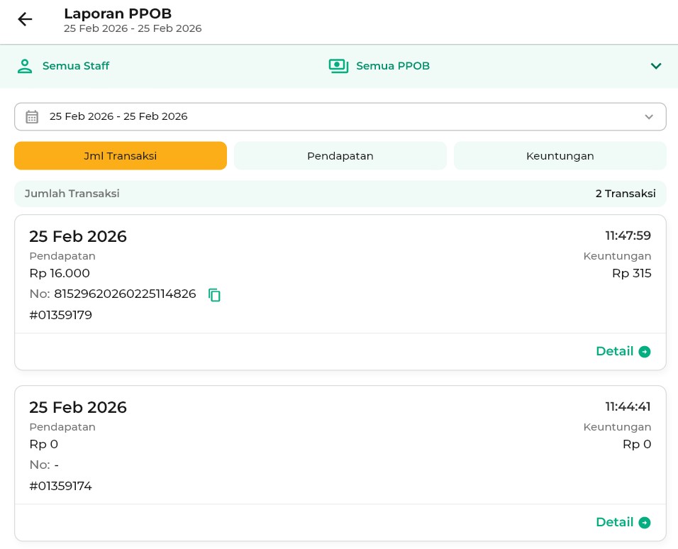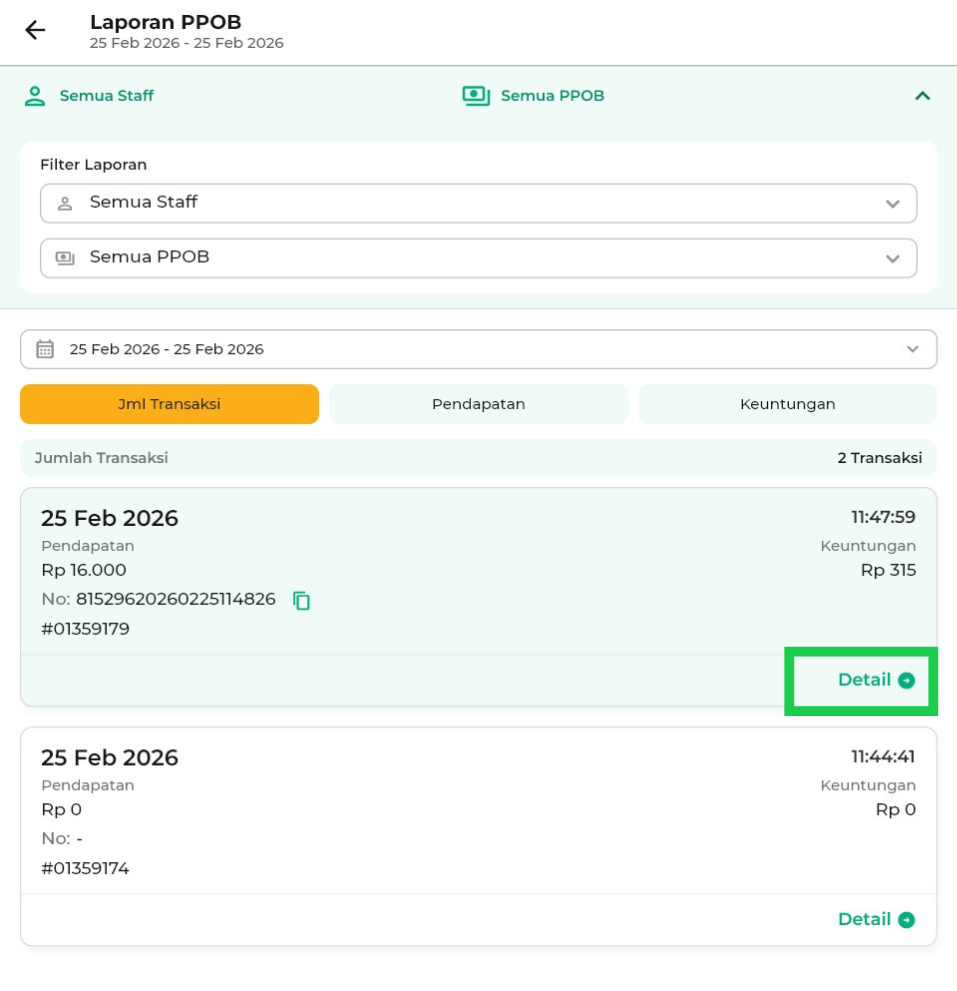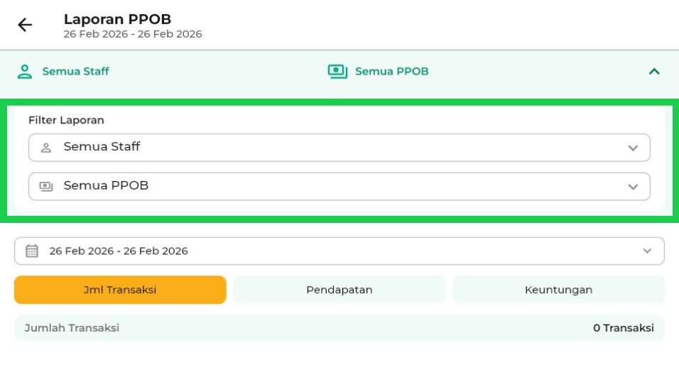 • Semua Staff: menampilkan laporan PPOB yang dilakukan oleh semua staff.