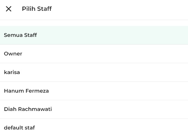 • Staff: pilih staff tertentu untuk menampilkan transaksi berdasarkan pilihan staff kerjakan.