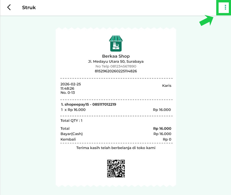 • Ikon titik tiga: Membuka opsi fitur tambahan, seperti mencetak, mengedit, atau melakukan retur struk.