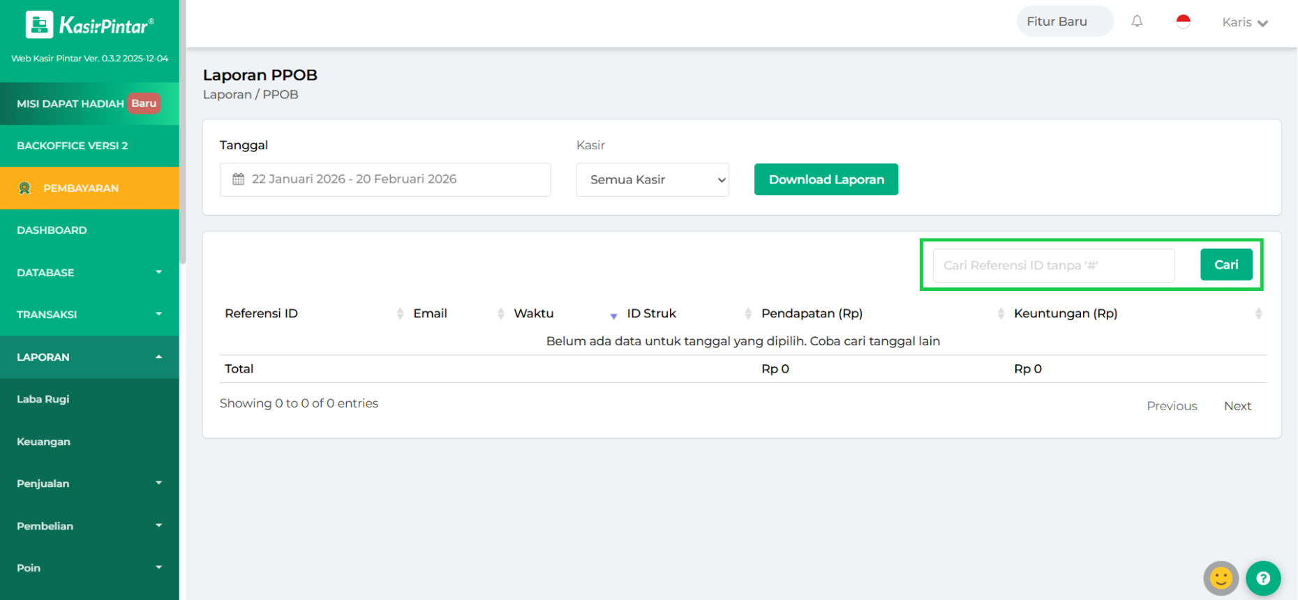 7. Anda dapat memanfaatkan pencarian laporan PPOB dengan klik Cari Referensi ID tanpa #.