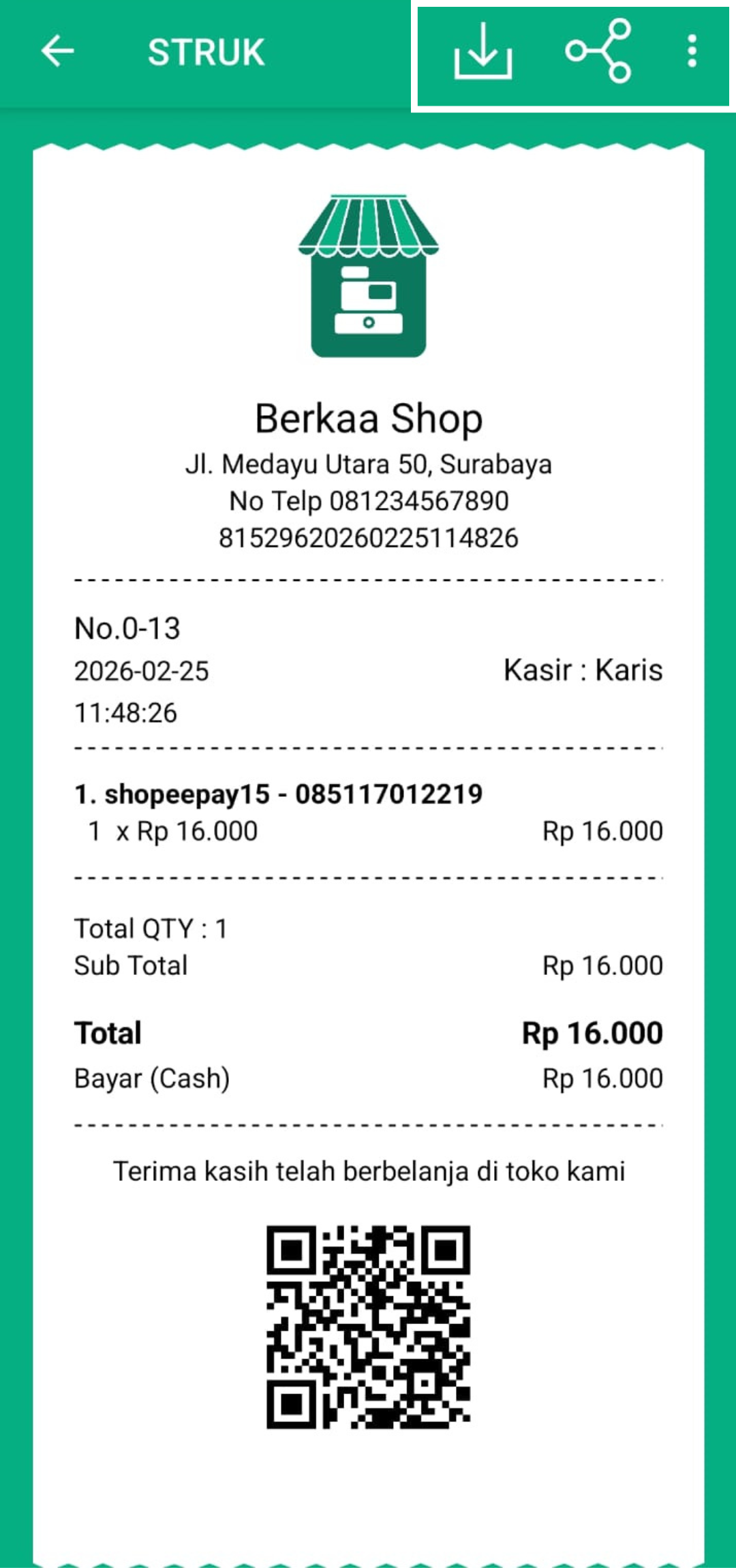 • Bagikan: Membagikan struk kepada pelanggan atau pihak terkait.