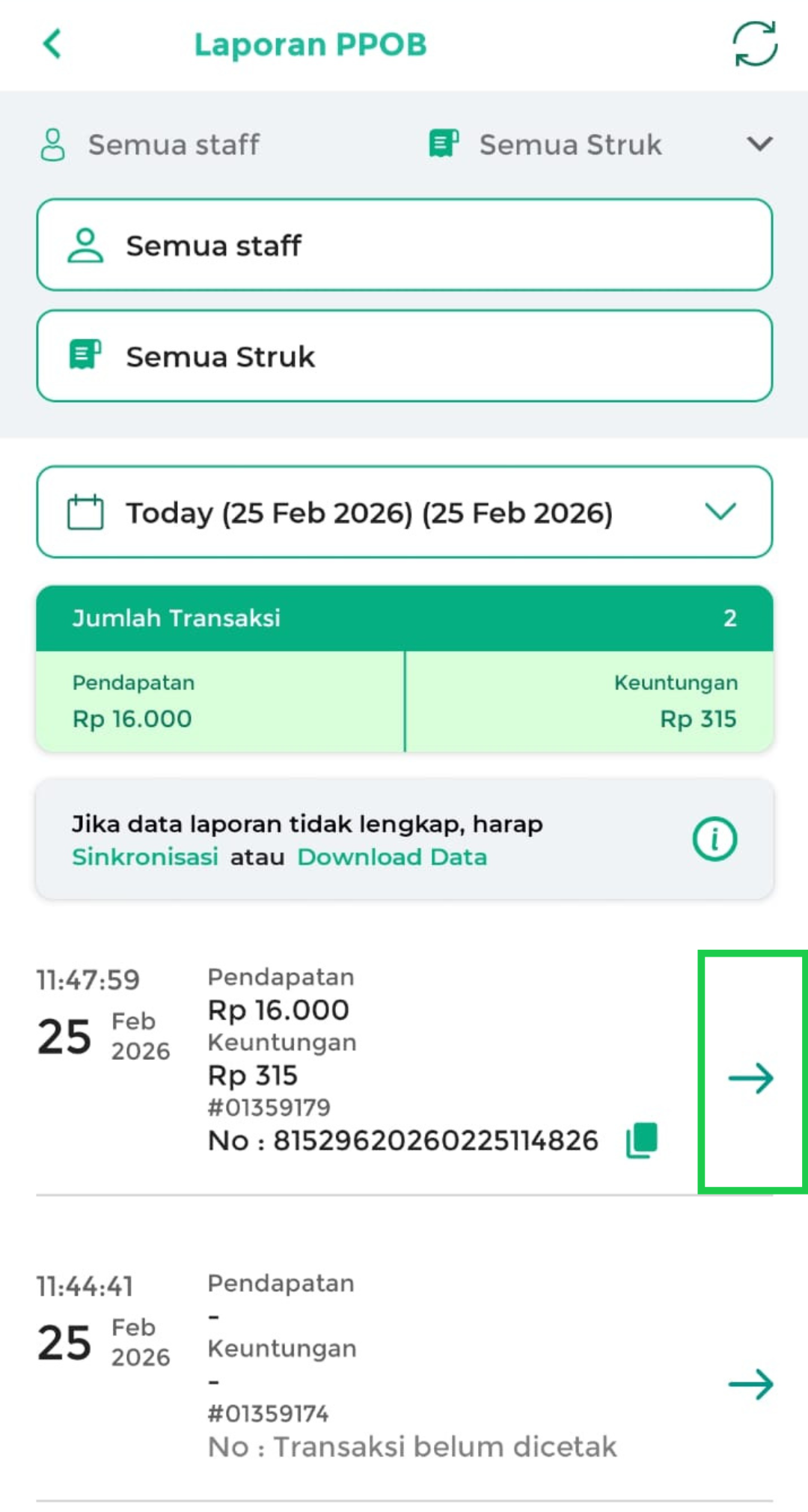 10. Anda dapat melihat rincian dari setiap transaksi PPOB. Untuk melihat detail transaksi PPOB, klik ikon panah dan struk transaksi akan muncul di halaman baru.