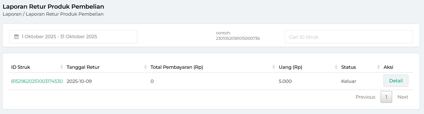 • Bulan Lalu: langsung mencakup seluruh data retur pembelian dalam 1 bulan sebelumnya.