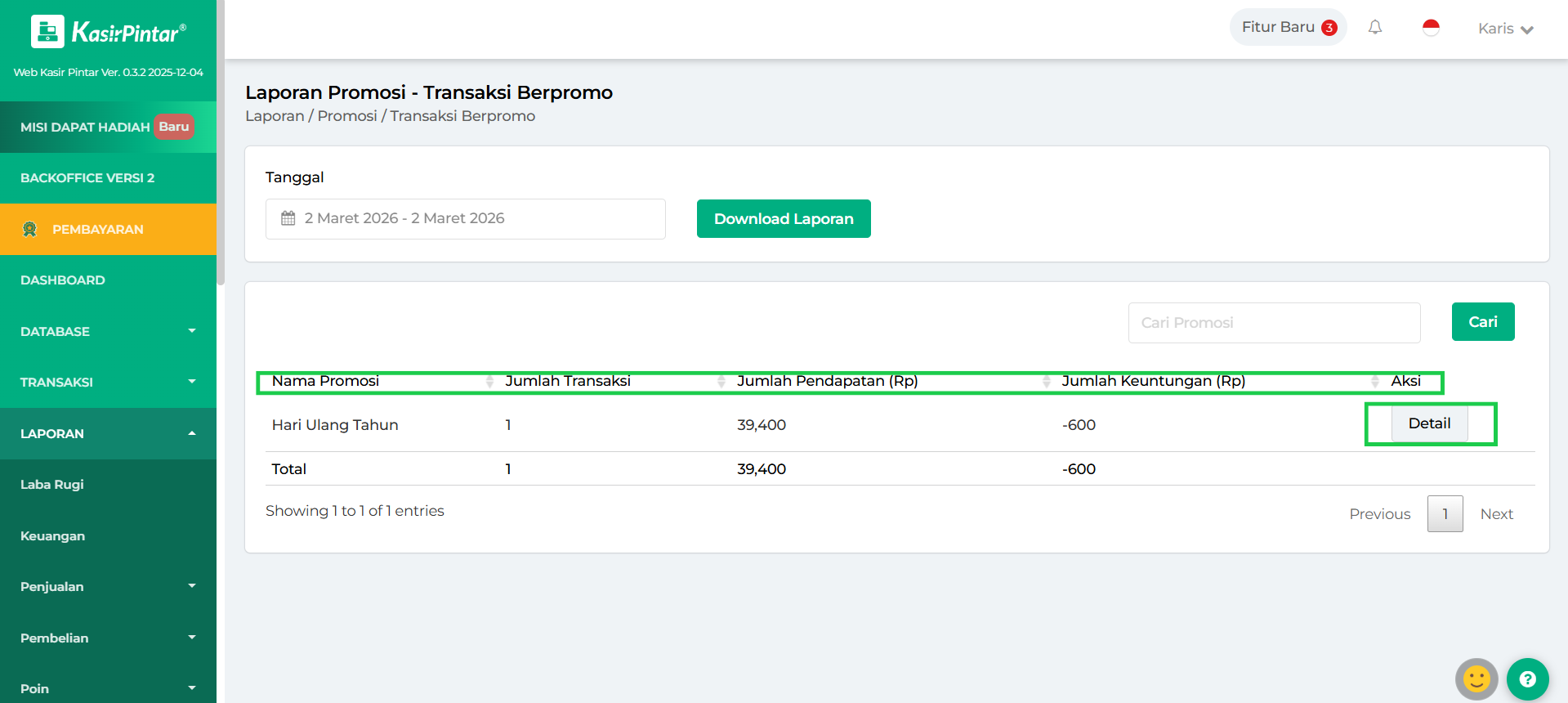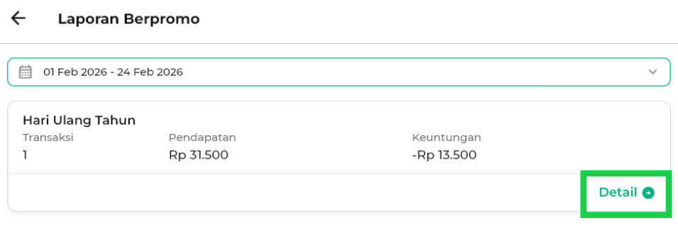 Transaksi dari kategori promo yang dipilih akan muncul di halaman samping. Jika anda ingin melihat detail dari transaksi tersebut, Anda dapat klik Detail.