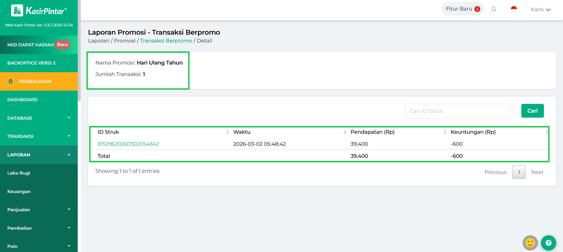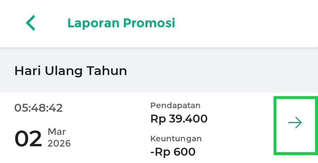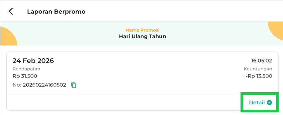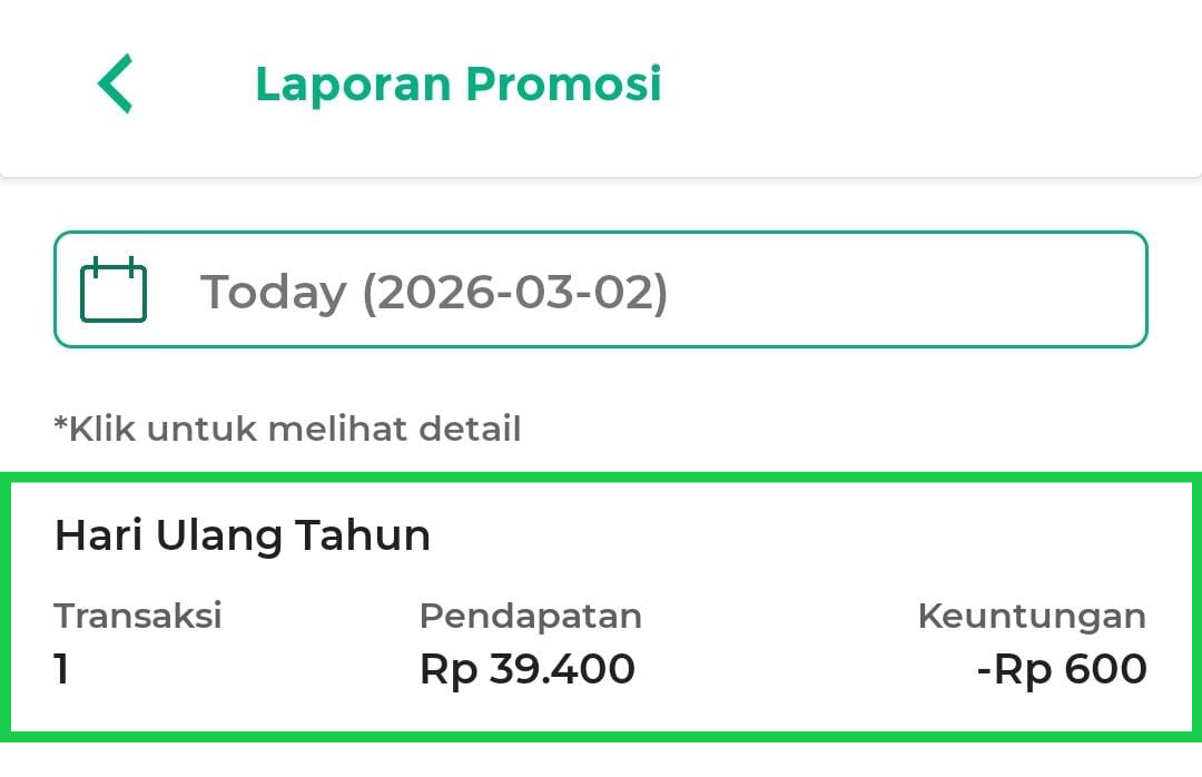 6. Anda dapat melihat informasi total, pendapatan, dan keuntungan dari transaksi berpromo seperti berikut: