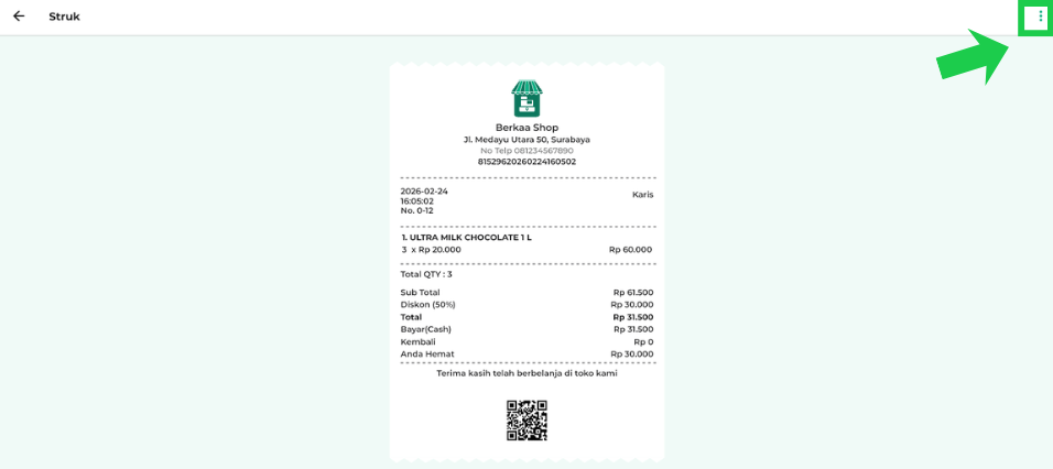 - Ikon titik tiga: Membuka opsi fitur tambahan, seperti mencetak, mengedit, atau melakukan retur struk.