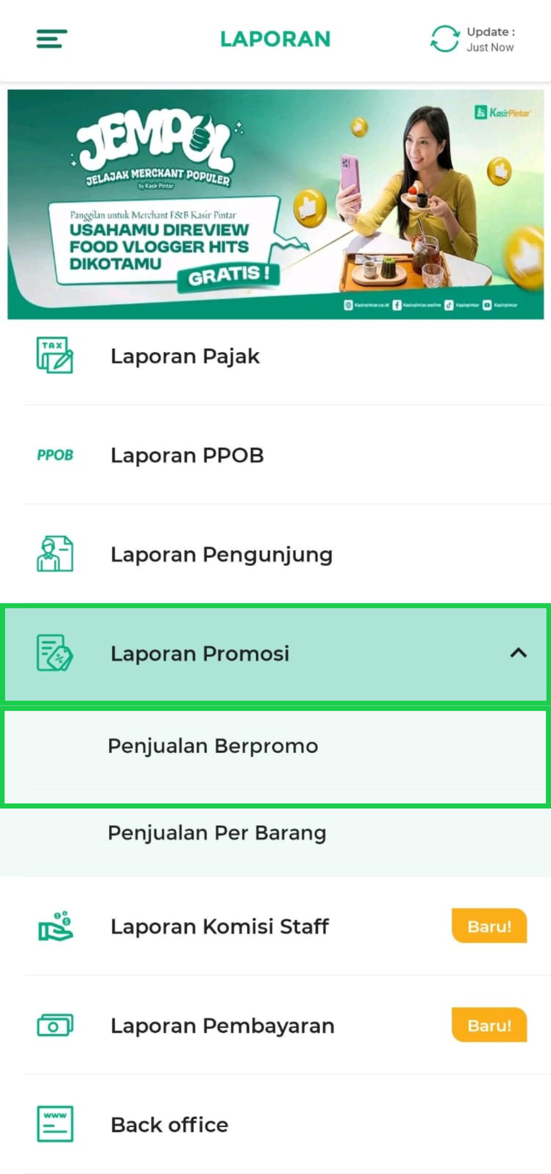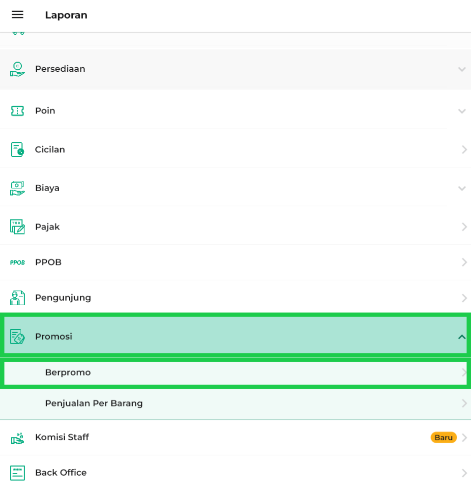 Berikut langkah-langkah mengakses Laporan Berpromo melalui Kasir Pintar Pro dan Kasir Pintar Dashboard (iOS) :