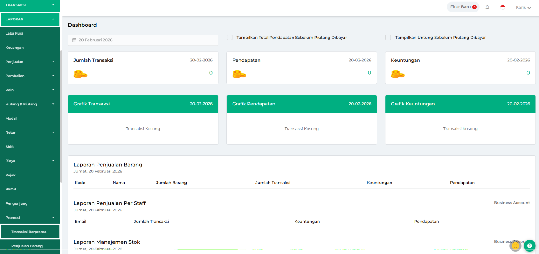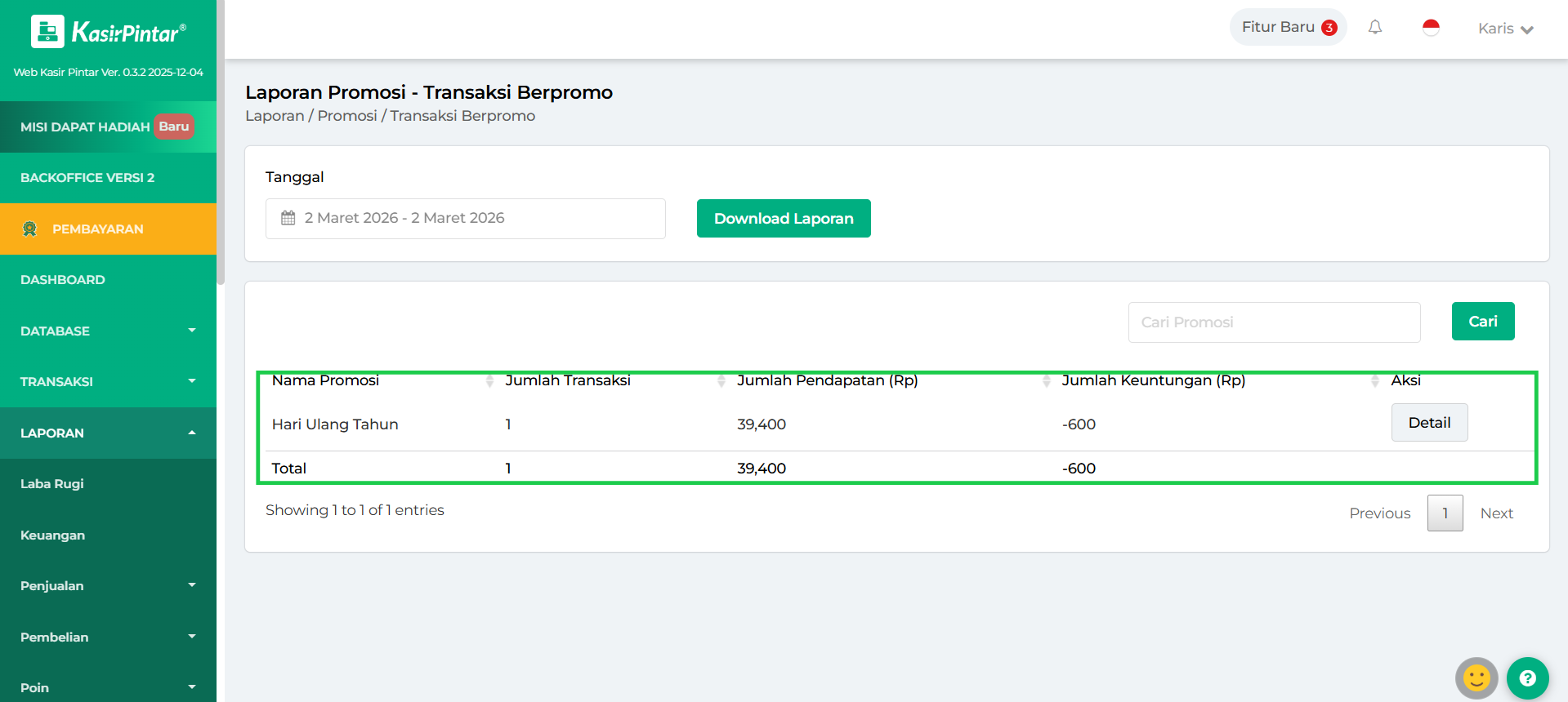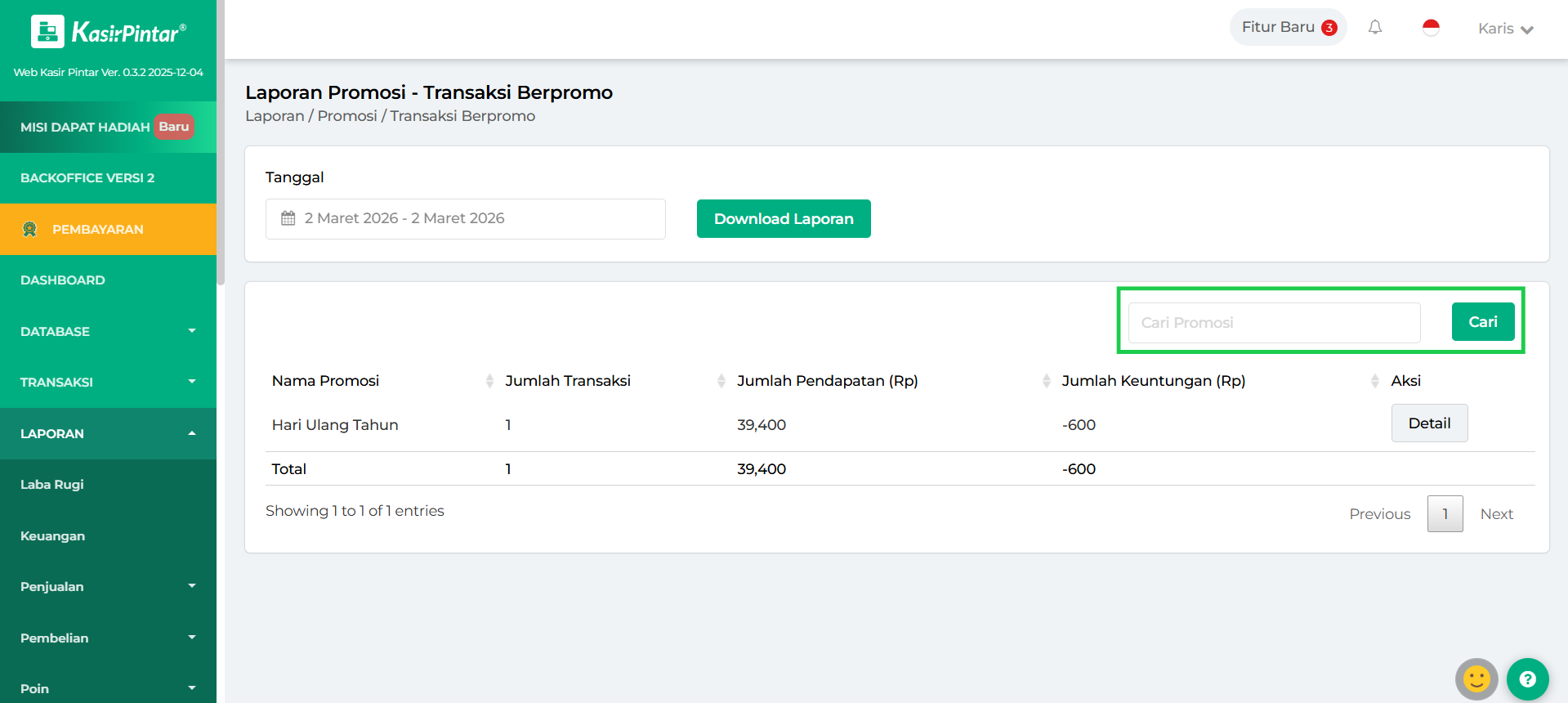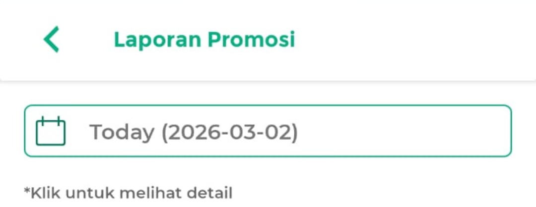 - Hari Ini: menampilkan laporan transaksi berpromo hari ini.