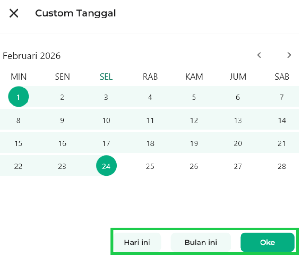 - Custom Tanggal: pilih sendiri jangka waktu laporan transaksi berpromo sesuai kebutuhan, kemudian klik Oke.